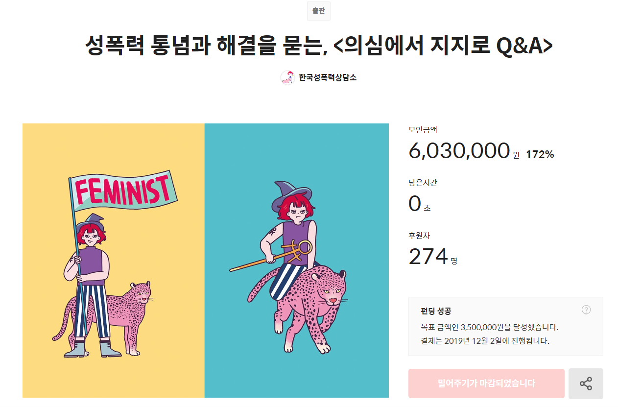 <의심에서 지지로 Q&A> 텀블벅은 바로 이 자료집을 더욱 많은 곳에 배포하기 위해 시작하게 되었습니다. 텀블벅 100% 달성 하기만 하면 전국 경찰·검찰·법원의 성폭력 관련 부서, 교육청의 성폭력 신고센터에 보내겠다는 야심찬 공약을 걸고 텀블벅을 시작하게 되었습니다.
