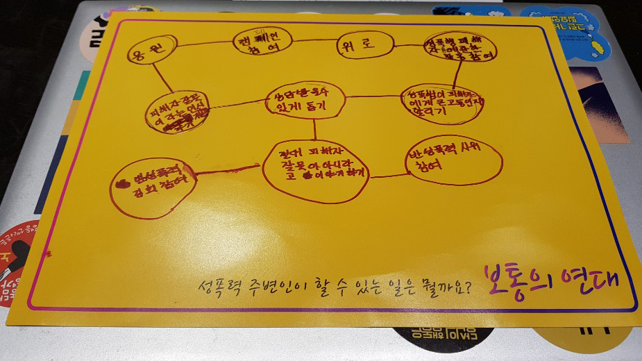 저는 성폭력에 관한 인식들이 많이 바뀌었으면 좋겠고, 가해자 처벌이 강화되었으면 좋겠다고 생각을 합니다. 그렇게 되려면 인식 개선 활동에 참여해서 사람들의 인식을 바꿔야 한다고 생각해요. 특히 다른 사람의 인식을 바꾸는 게 쉽지는 않겠지만 반성폭력 활동 같은 데에 참여해야 할 것 같아요.