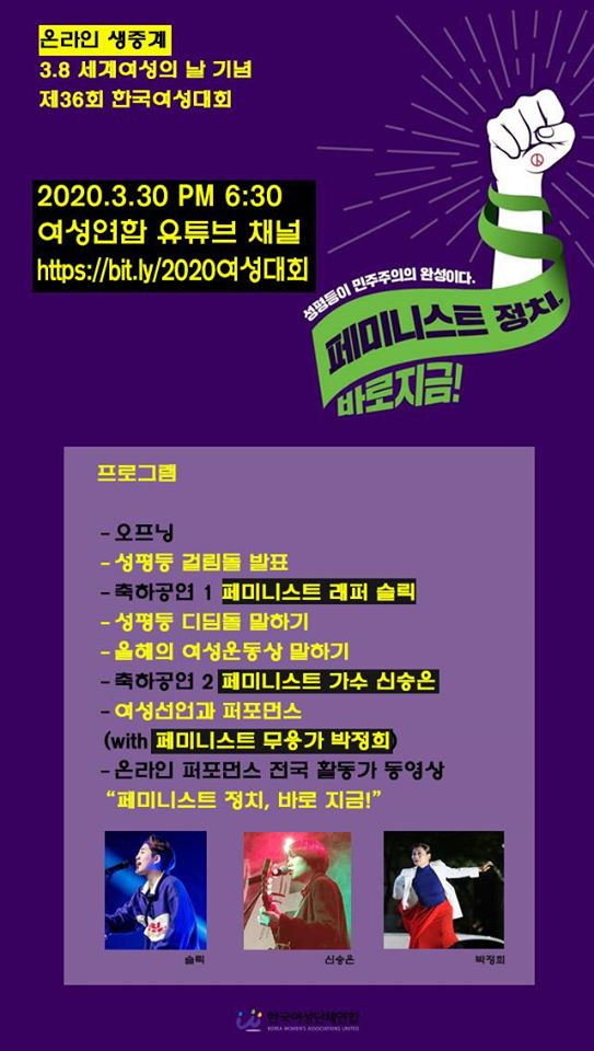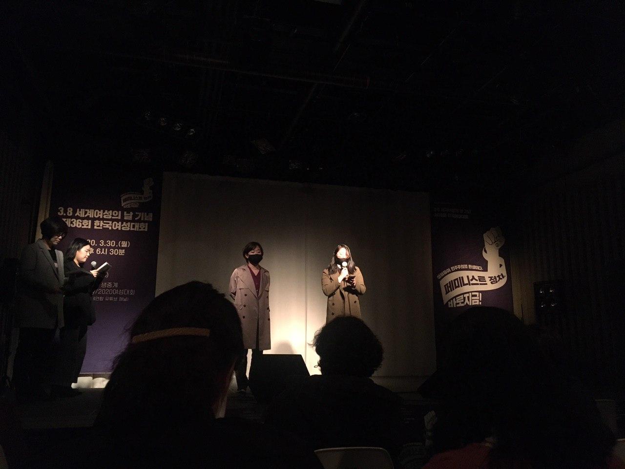 한국여성대회는 3월 8일 세계여성의날을 맞아 진행되었던 행사로, 1985년부터 시작되어 올해 제 36회를 맞았습니다. 올해는 온라인 생중계로 기념대회를 진행했는데요, 한국여성대회가 늘 온라인으로 진행된 것은 아닙니다. 작년까지만 해도 광화문 광장에서 수많은 시민들과 여성단체들이 모여서 성평등 의제를 확인하고 목소리 높여 외치는 자리였습니다. 한국사회의 성평등 걸림돌과 디딤돌을 시상하고, 많은 여성단체나 모임에서 시민들이 참여할 수 있는 부스를 운영하고, 성평등 의제를 외치며 행진도 하는 축제 같은 자리였어요. 그러나 올해 코로나 19로 인하여 광장이 열리지 않았고 총선을 넘기면 ‘성평등은 민주주의의 완성이다. 페미니스트 정치 지금 당장!’이라는 주제의 시의성이 없게 되어, 주최측인 ‘한국여성단체연합’에서는 대안적인 방법을 모색했습니다. 그 결과 홍대의 작은 소극장을 빌려 계획했던 프로그램을 공간에 맞게 변형하여 진행하고, 유튜브를 통해 온라인 생중계를 하는 방식으로 진행하게 된 것입니다. 상담소는 한국여성단체연합의 회원 단체이자 3.8 기획실행위 단위로 행사를 방청하게 되었습니다.