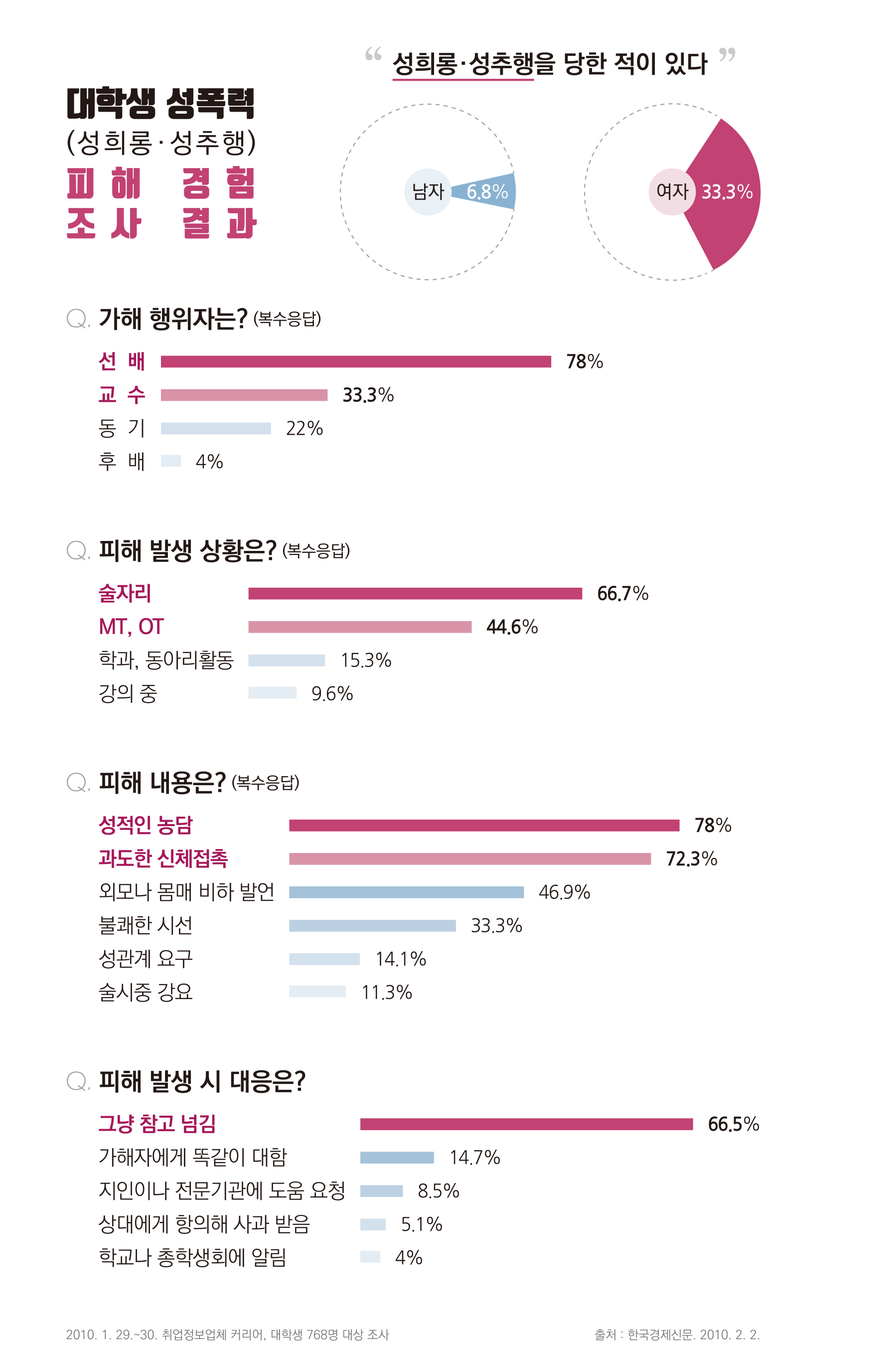 어떤 교수는 외부에서 성희롱 발언을 해서 신고를 당했는데, 학교에서 처리를 한 거예요. 결국은 학교에서 징계가 이루어지지 않았어요. 그냥 학교 입장에서 외부에 있는 신고한 분한테 최대한 성의를 다해서 사과했더라고요. 신고한 분이 그걸 받아들였대요. 사실 이건 학교에 신고가 돼서 그런 거고, 신고한 분이 억울하다 싶으면 국가인권위원회나 더 높은 상위 기관으로 신고를 했을 텐데. 어쨌든 학교는 교수에 대해서 어떠한 징계처분도 하지 않았어요. 그 교수는 다음 학기에 버젓이 강의했고요. 그래도 속으로 월급은 좀 깎았겠지? (웃음)’라고 생각을 했는데, ‘가해자는 뭐 아무것도 부담을 지거나 책임에 대한 대가를 치르는 게 없네.’ 되게 찜찜하고요.
