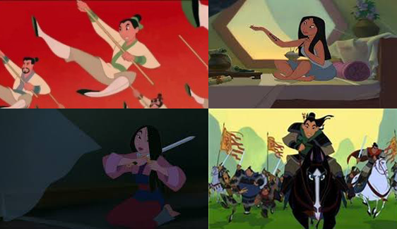 다음으로 1998년 작품인 디즈니 애니메이션 뮬란의 간략한 줄거리이다. 여자는 좋은 가문에 시집을 가는 것만이 가문을 빛내고 명예를 가져다주는 일이었던 시대에 사는 주인공 뮬란은 사회가 규정한 완벽한 신붓감이 될 수가 없었다. 활기차고 총명한 뮬란은 얌전하고 순종적인 여성상에 부합하지 않았고, 급하게 스타일링을 받아 화장하고 행동교정에 한껏 치장한 채 매파와 만나지만 본의 아니게 소동을 일으켜 좋은 신붓감으로 높은 점수를 받는 일에 실패한다. 그 일로 가족들은 뮬란에게 실망을 감추지 못한다. 극 중에서 뮬란은 혼자 고뇌하며 아무리 애써도 자신의 본 모습을 감출 수 없고, 진정한 자신을 모습으로 살아가고 싶다고 노래한다. 그러던 중 훈족이 국경을 넘어 침략해오자, 나라에서는 모든 가문에서 남자 한 명씩은 반드시 전쟁에 참여하라는 징집 명령이 떨어진다. ‘파씨’ 가문의 유일한 딸이었던 뮬란은 몸이 아픈 아버지를 대신해 머리카락을 자르고, 아버지의 갑옷을 몰래 입고 전쟁터에 나가게 된다. 아버지를 대신해 ‘핑’이라는 이름으로 군대 신병교육에 합류해, 군인이 되기 위한 고난의 훈련을 통과하고 군인 ‘핑’으로 거듭나게 된다. 고생 끝에 전쟁터에서 지략으로 장군의 아들 ‘리샹’과 동료들을 살려내고 공로를 인정받지만, 부상으로 인해 ‘핑’이 ‘뮬란’임이 드러나 또 다른 위기에 봉착한다. 이 영화는 ‘핑’과 ‘뮬란’ 사이에서 진정한 자신의 모습을 찾아가는 한 편의 활극 로드무비로 더 자세한 이야기와 결말은 영화를 통해 확인하길 바란다.