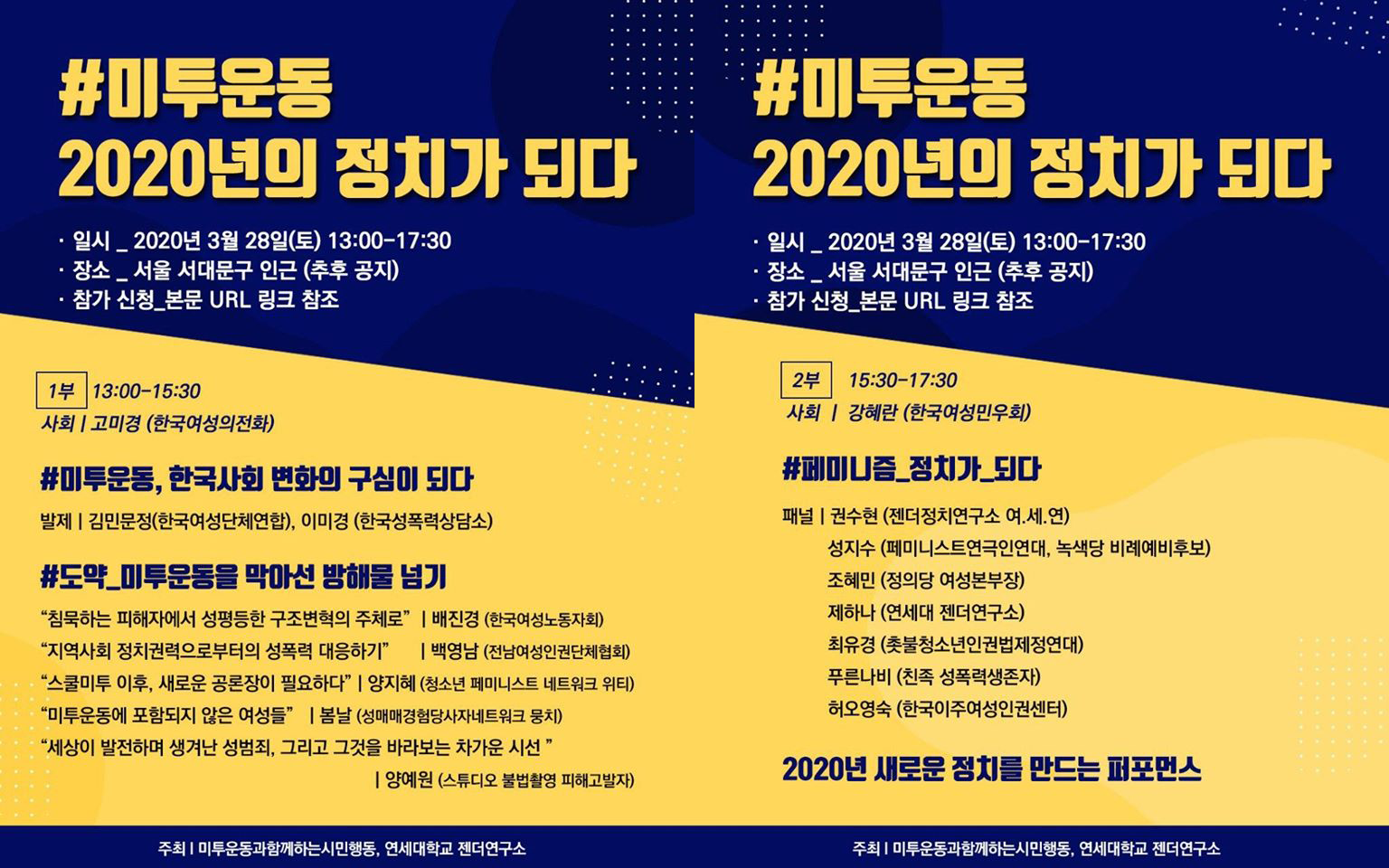 2부의 제목은 “#미투운동 2020년의 정치가 되다”입니다. 2부에서는 친족 성폭력 생존자, 이주여성 활동가, 청소년 페미니스트, 20대 페미니스트, 청년 정치인 등 다양한 배경을 가진 토론자들이 미투운동으로부터 이어지는 정치적 의제와 과제에 관해 발표했습니다. 사회를 변화시켰던 미투운동은 곧 정치적 운동입니다. 미투운동을 통해 구체화되었던 여성들, 페미니스트들이 법과 제도와 정책을 감시하고 요구할 때, 사회는 흔들릴 것이고 성평등한 변화가 시작될 것입니다.