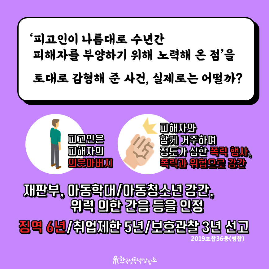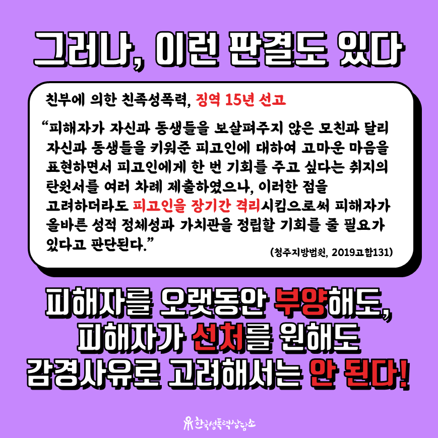 그렇다면 과연 법원에서는 친족성폭력 피해자의 말하기를 제대로 듣고 있을까요? 피해자를 '부양'했다는 이유로 감형해주고 있지는 않을까요? 한국성폭력상담소가 분석한 2019년 1, 2심 판결문 중 친족성폭력 관련 내용을 카드뉴스로 만들어 보았습니다. 함께 읽어주세요!