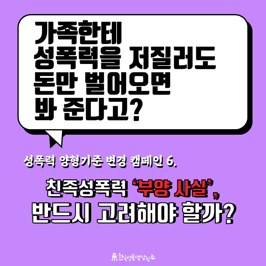 그렇다면 과연 법원에서는 친족성폭력 피해자의 말하기를 제대로 듣고 있을까요? 피해자를 '부양'했다는 이유로 감형해주고 있지는 않을까요? 한국성폭력상담소가 분석한 2019년 1, 2심 판결문 중 친족성폭력 관련 내용을 카드뉴스로 만들어 보았습니다. 함께 읽어주세요!