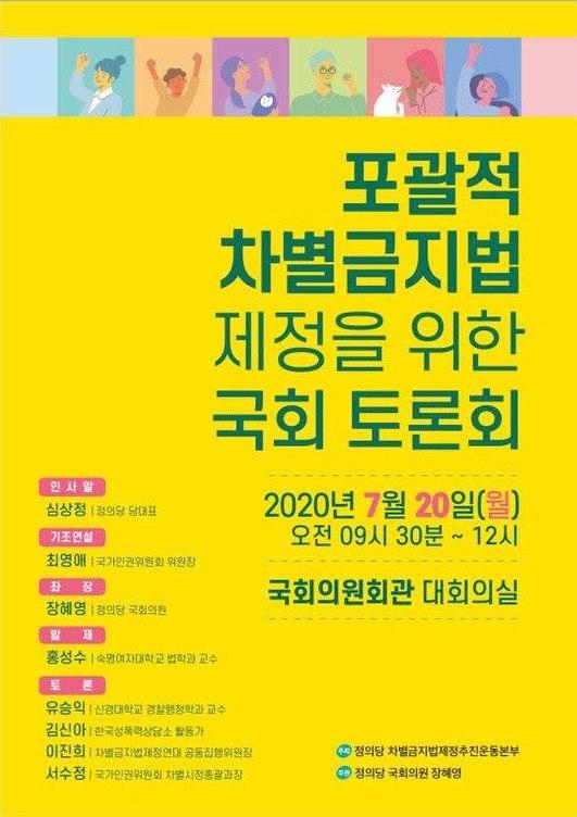 지난 7월 20일 정의당 차별금지법제정추진운동본부 주최, 정의당 장혜영 국회의원 주관으로 ‘포괄적 차별금지법제정을 위한 국회 토론회’가 진행되었습니다. 정의당은 6월 29일 장혜영 의원의 대표발의로 9인의 국회의원과 함께 차별금지법을 발의한 상황인데요. 차별금지법의 필요성을 다시 한번 되짚어보는 시간이었습니다.