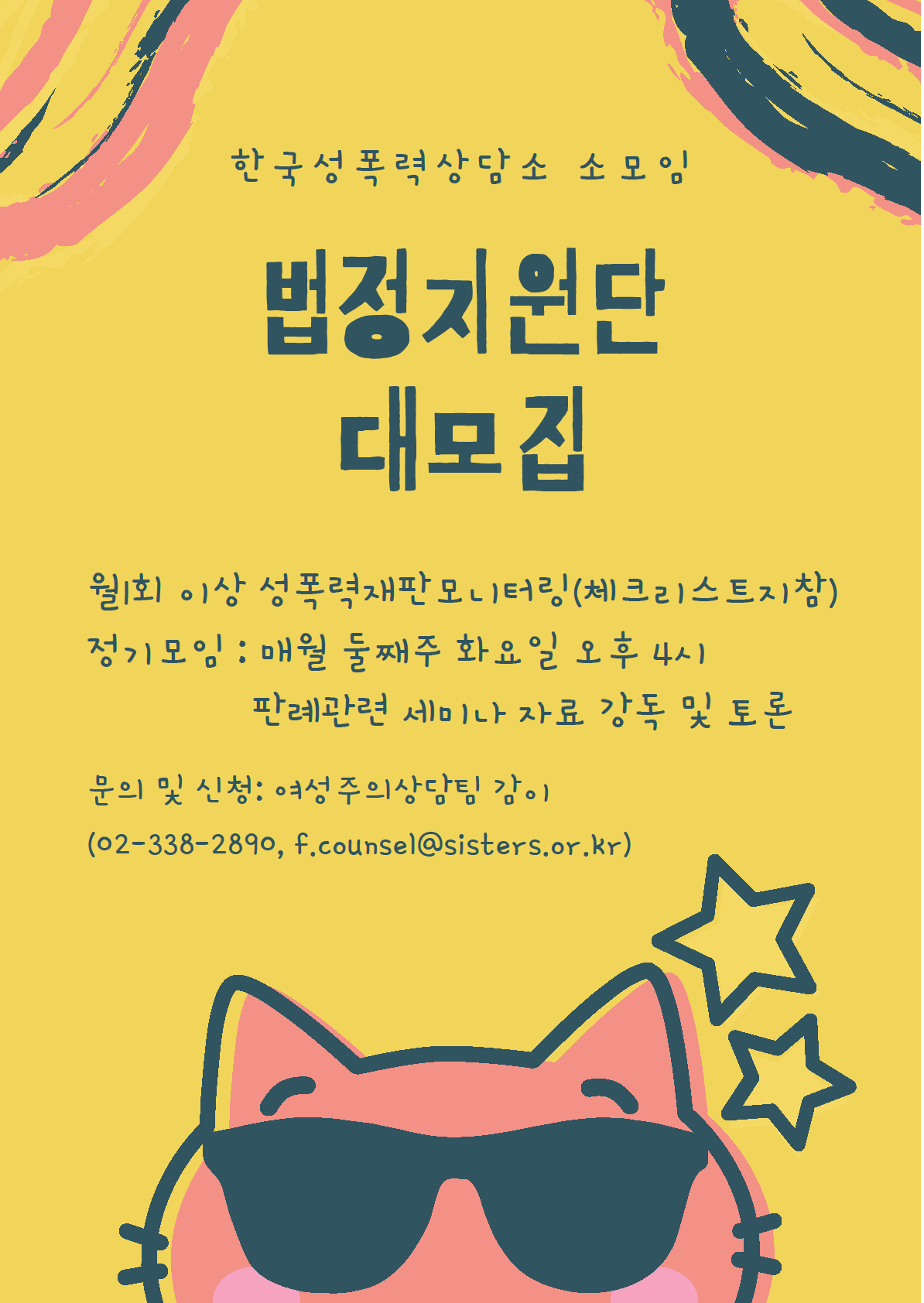 올해 4월부터 법정모니터링단 <매서운 눈초리> (줄여서 매초리)라는 새로운 이름을 얻어 한국성폭력상담소의 회원소모임으로 재탄생하였습니다.