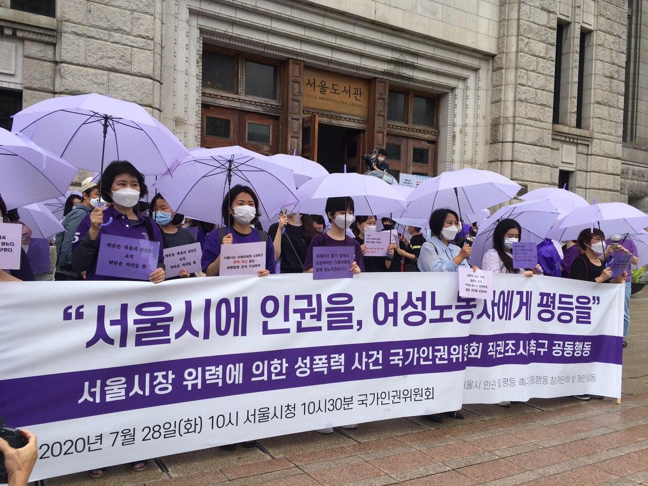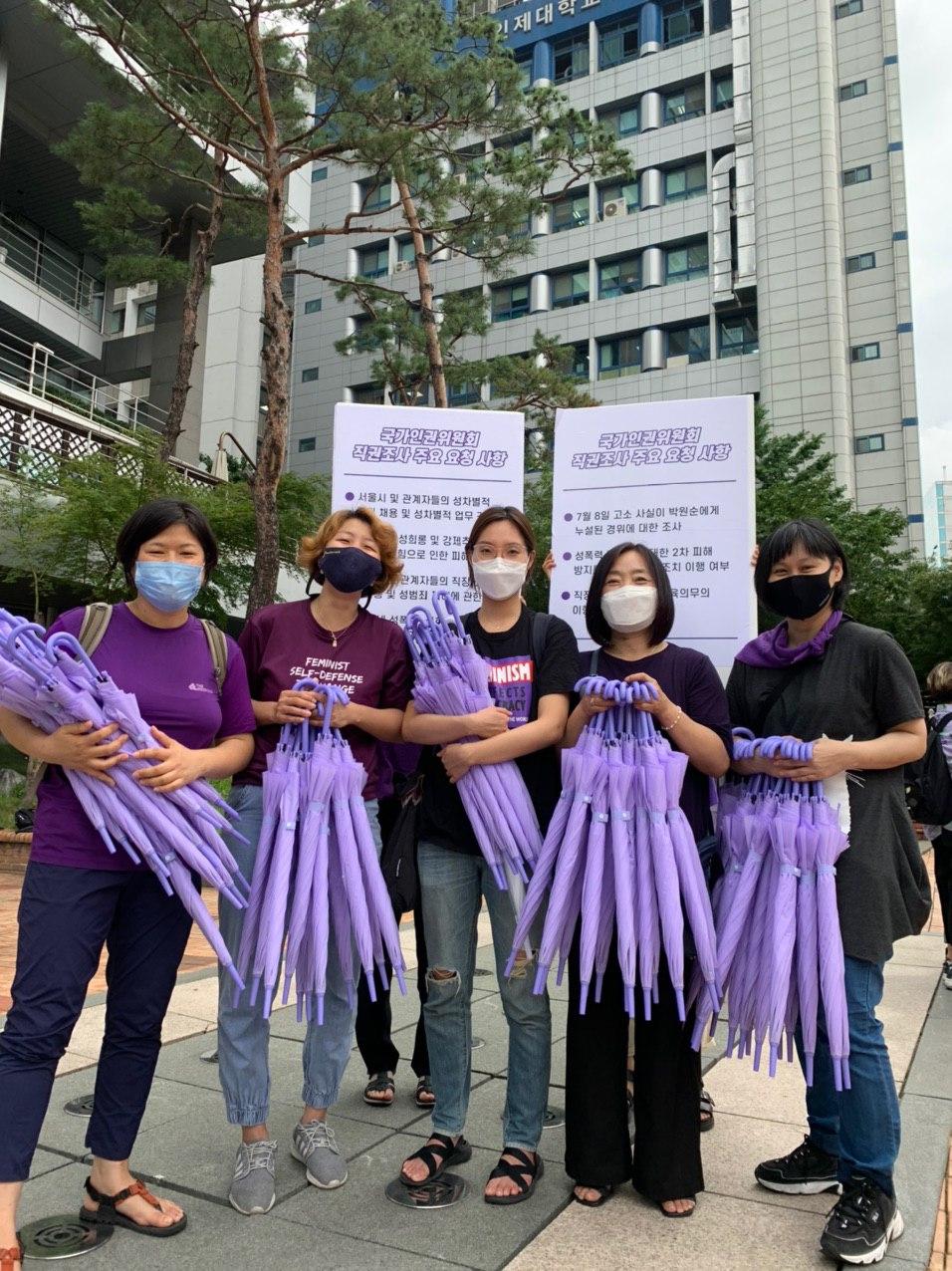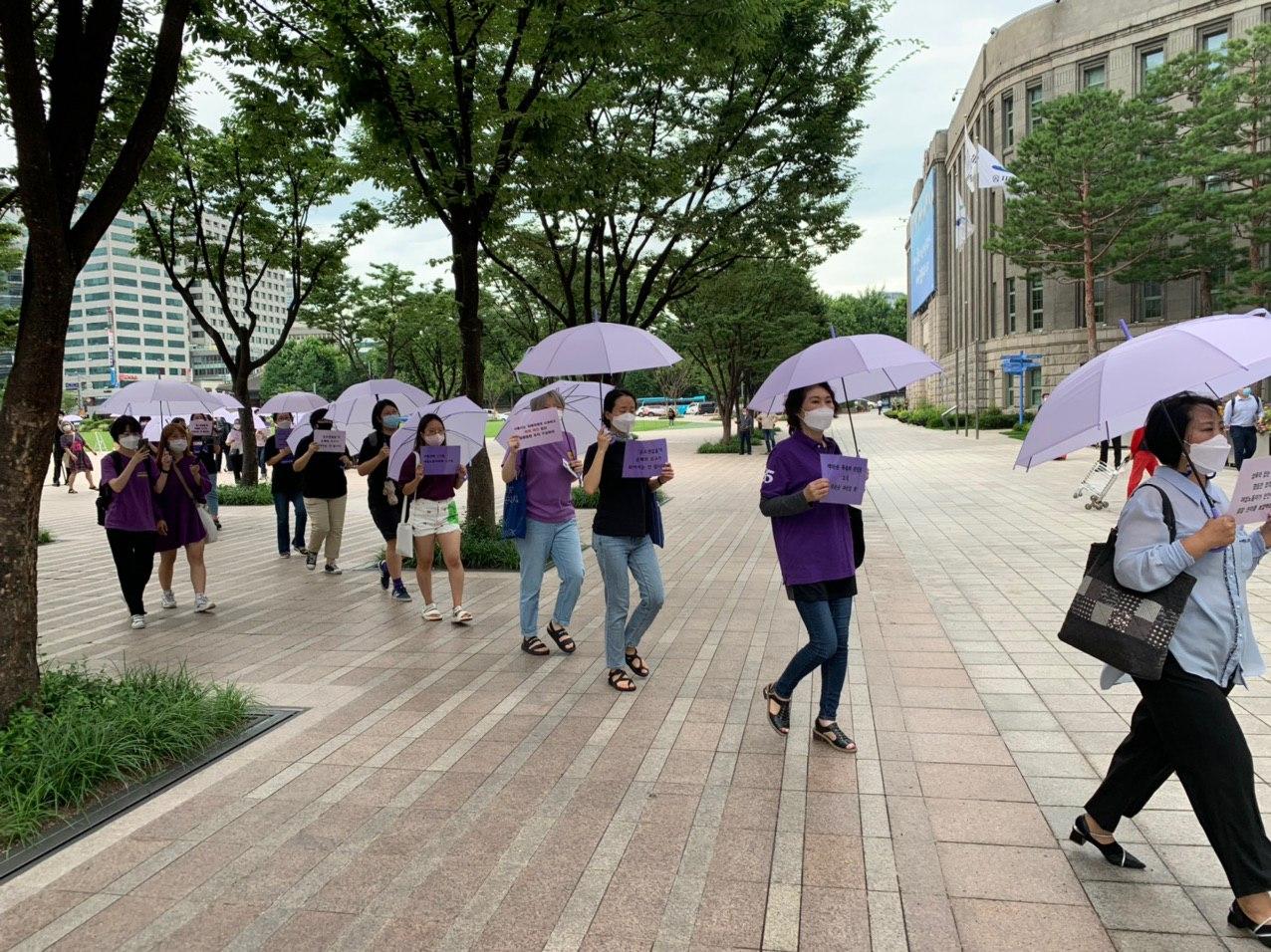 7월 28일 화요일 오전, 서울시청부터 국가인권위원회까지 보랏빛 우산과 피켓, 복장을 한 여성시민들은 보도를 행진했습니다. 서울시장에 의한 위력 성폭력이 세상에 알려진 지 2주가 넘어, 진상규명을 위해 국가인권위원회에 직권조사 발동 촉구를 하기 위해서였습니다.