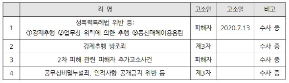 현재 진행중인 사건(성폭력특례법 위반 등 ①강제추행 ②업무상 위력에 의한 추행 ③통신매체이용음란, 강제추행 방조죄, 2차 피해 관련 피해자 추가고소건, 공무상 비밀누설되, 인적사항 긍개금지 위반 등)을 정리하였고, 각 사건의 쟁점을 짚어 설명하였습니다.