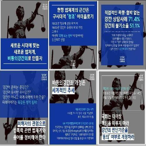 작년 3월, 전국 210개 여성인권단체에서는 <‘강간죄’ 구성요건 개정을 위한 연대회의>를 발족하고 형법 학자를 비롯해 뜻을 같이하는 전문가들과 함께 우리가 바라는 법률개정안을 만들어 뜻을 함께하는 국회의원들과 토론회를 개최했습니다. 그리고 국회 법사위에 5차례에 걸친 의견서 제출, 정부 관계자들 면담, 동영상 제작, 카드뉴스 등을 통해 이 법안의 필요성을 강조해왔습니다. 오늘 발의된 류호정의원 대표발의안은 본 연대회의 법안을 적극 수용한 법안입니다. 지금까지 우리 형법의 폭행·협박에 기반한 강간죄 구성요건은 수 많은 피해자들의 인권에 눈감아왔습니다. 나중으로 미뤄도 되는 인권은 없습니다! 이제 국회는 더 이상 미루지 말고 이 법안에 대한 심의·의결할 책무가 있습니다.