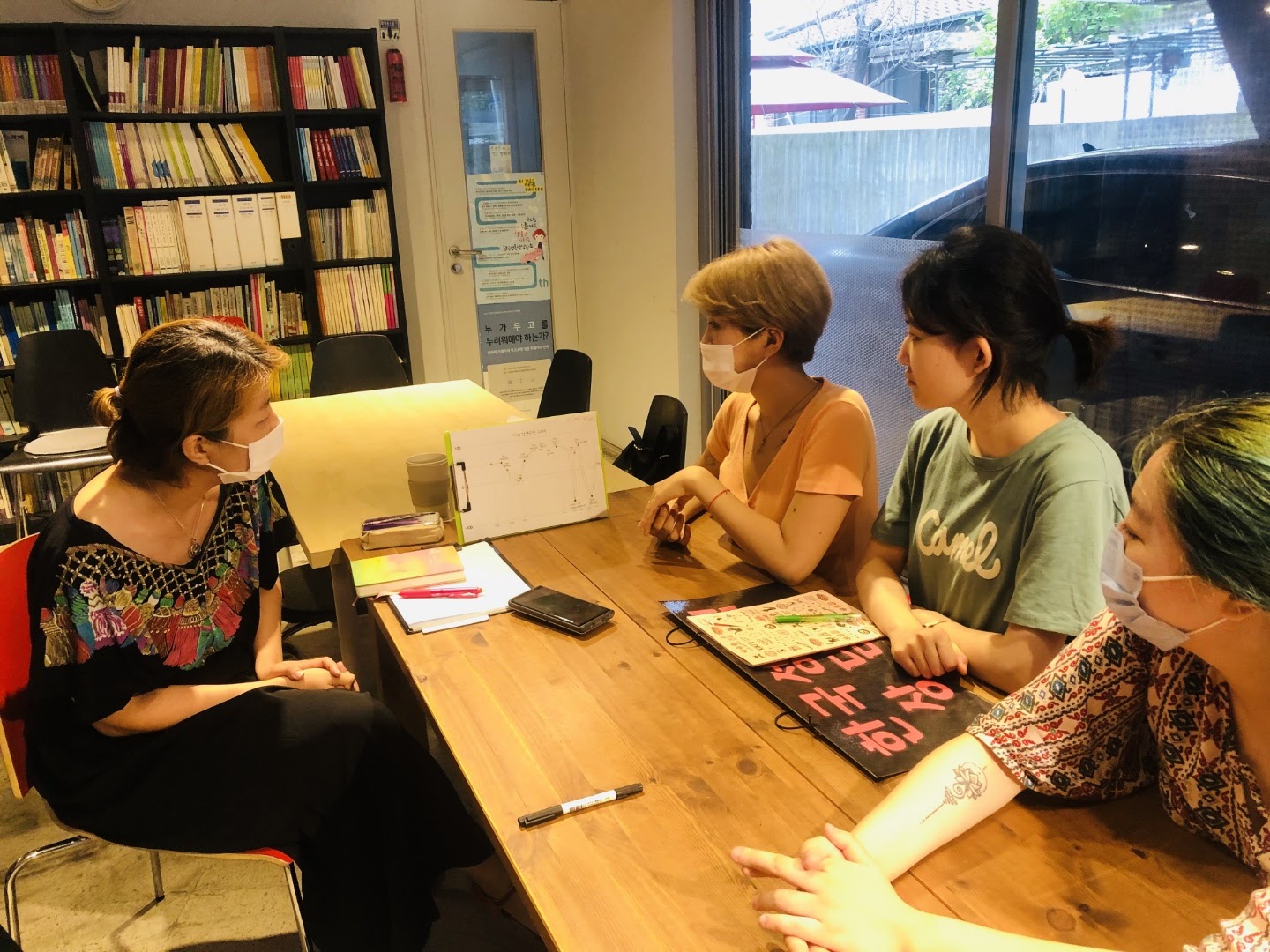 상담소 1층에서 인터뷰 중인 활동가들. 왼쪽부터 시계 방향으로 감이, 승은, 세린, 닻별.