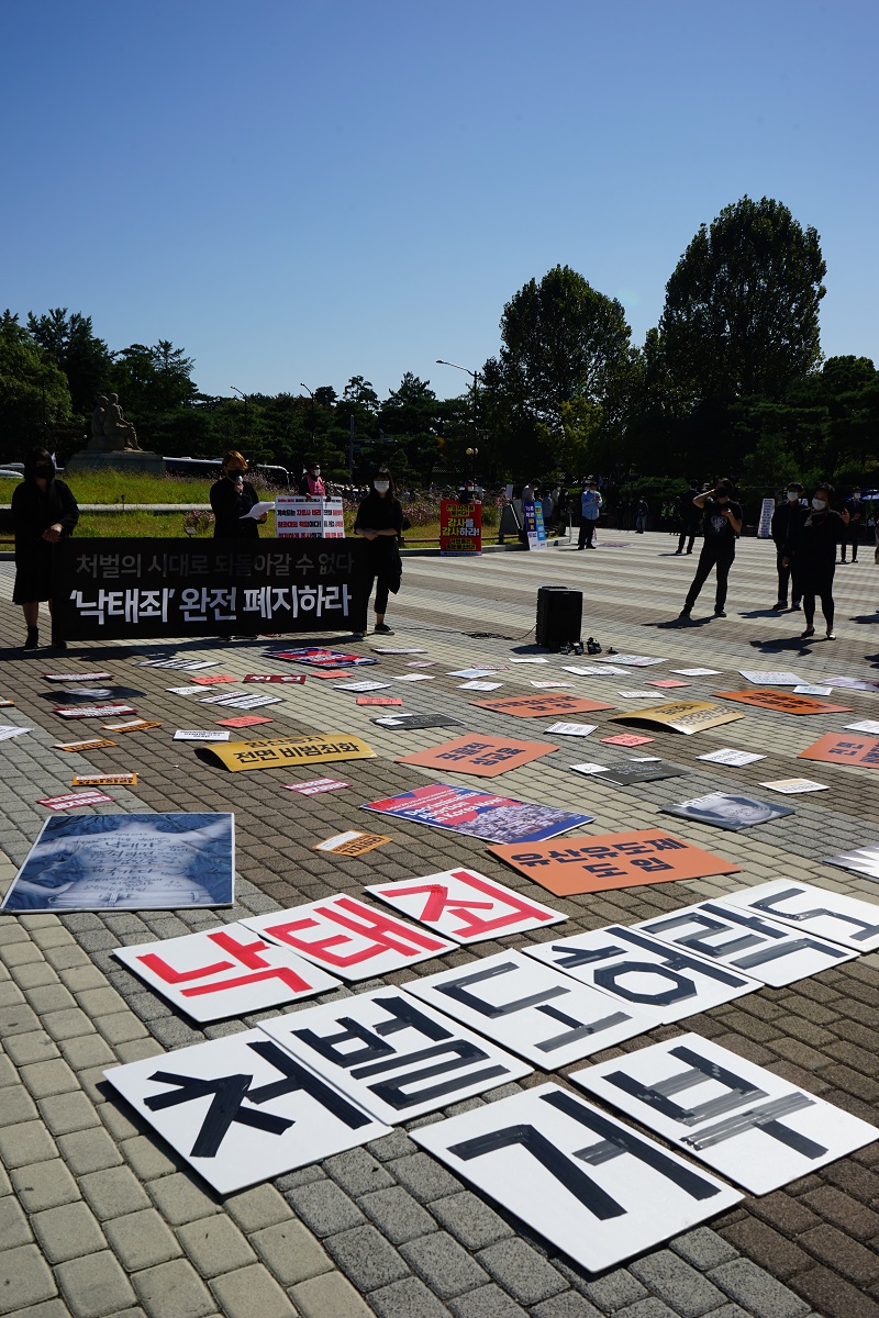 "그동안 우리들은 성과 재생산 권리를 보장하고 처벌도 낙인도 없는 사회를 바라며 거리로, 광장으로, 헌재 앞으로, 국회 앞으로 나와 수없이 목이 터져라 '낙태죄' 폐지를 외쳐 왔습니다. 여기 있는 이 피켓들은 그동안 우리가 검은 시위, 낙태죄 폐지 촉구 집회, 각종 기자회견, 퍼포먼스 등에서 실제로 사용했던 피켓들입니다. 우리가 '낙태죄'를 폐지하기 위해