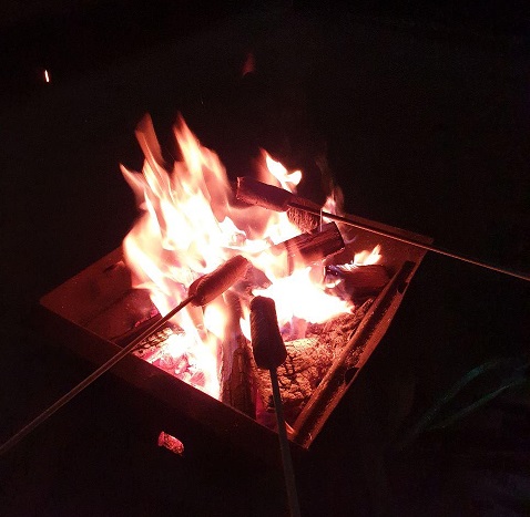 오늘의 메뉴는 새우감바스와 오뎅탕, 따뜻한 정종입니다. 밥은 덤으로... 정종이 넘어가는 그 따뜻함과 향기로움은 감동이었고 추워서 담요를 감싸고 먹는 맛이 더욱 좋았습니다. 배부르게 식사를 하고 불멍의 시간이 왔습니다. 바람이 많이 불어 생각했던 그런 불멍엔 미치지 못했고 바람으로, 연기로 이리저리 고개를 돌리는 시간이 많았습니다. 바람탓, 덜마른 나무탓을 하면서도 가래떡과 버섯 등 구워 먹을 수 있는 다양한 것들을 꼬치에 꽂아 시커먼 그으름이 생기기도 했지만 다 재밌고 웃을 일이었습니다.