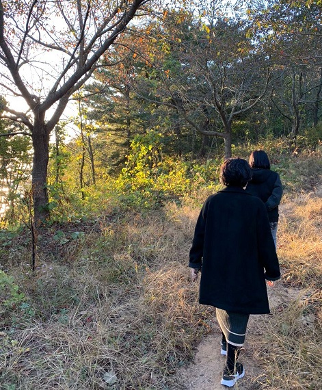 체험을 끝내고 돌아오던 길에 산책로를 발견하고 가보기로 하였습니다. 낮은 산자락에 만들어진 오솔길이 숲멍의 시간이었습니다. 정상에 올라 멀리 바다도 내려다보고 생경스러운 포토존에 웃기도 하는 시간이었습니다.