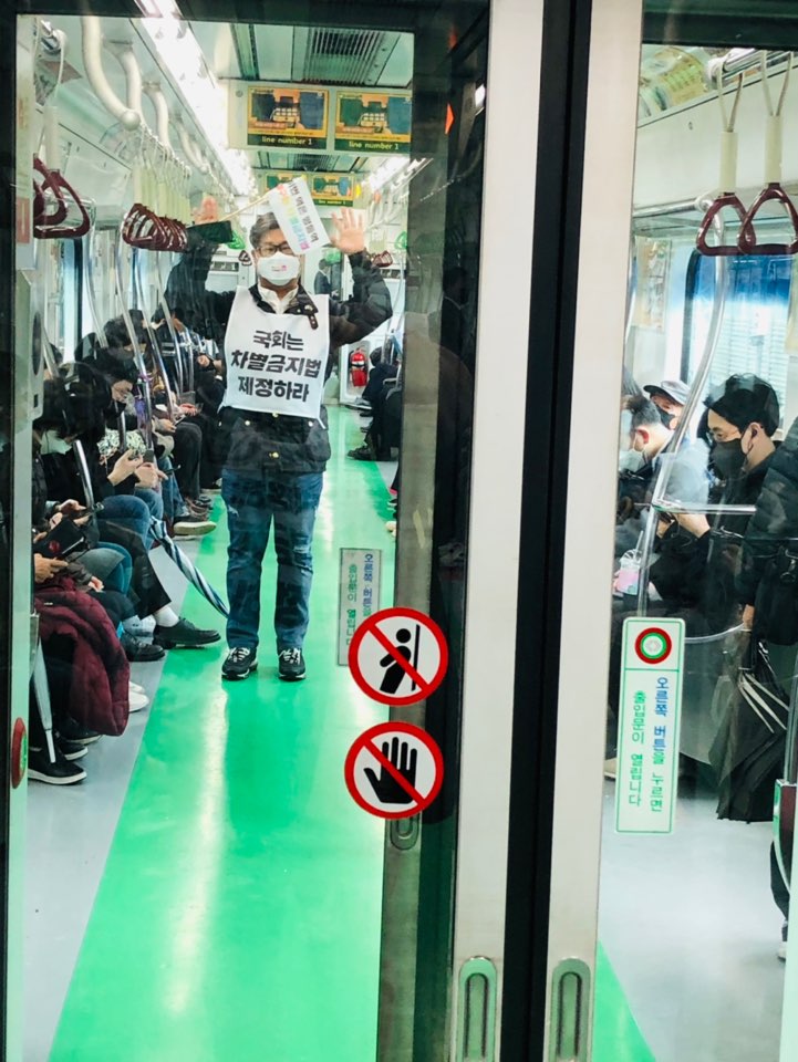 11월 19일 첫 번째 날엔 강남역에서 출발해 구의역, 시청역, 신촌역을 거쳐 국회의사당역으로 이동했습니다. 2016년 5월 17일 여성혐오살인사건이 있었던 강남역에서 출발하여 20대 비정규직 노동자가 숨졌던 구의역, 성소수자 관련 광고판이 훼손되었던 신촌역 등 차별과 혐오 이슈가 있었던 역에서는 잠시 내려 묵념을 하거나 잠시 머물기도 했습니다. 여러 단체들에서 각 역에 해당하는 이야기를 작성해주어 페이스북을 통해 공유했습니다. 지하철에서 액션단을 본 시민들은 ‘나도 지지한다’ ‘고맙다’ 응원의 인사를 건네주었고 함께 기념사진을 찍자고 하는 분도 있었습니다. 손가락질 하는 분도 보았지만, 액션단은 차별금지법에 대한 지지의 온도를 느낄 수 있었습니다.