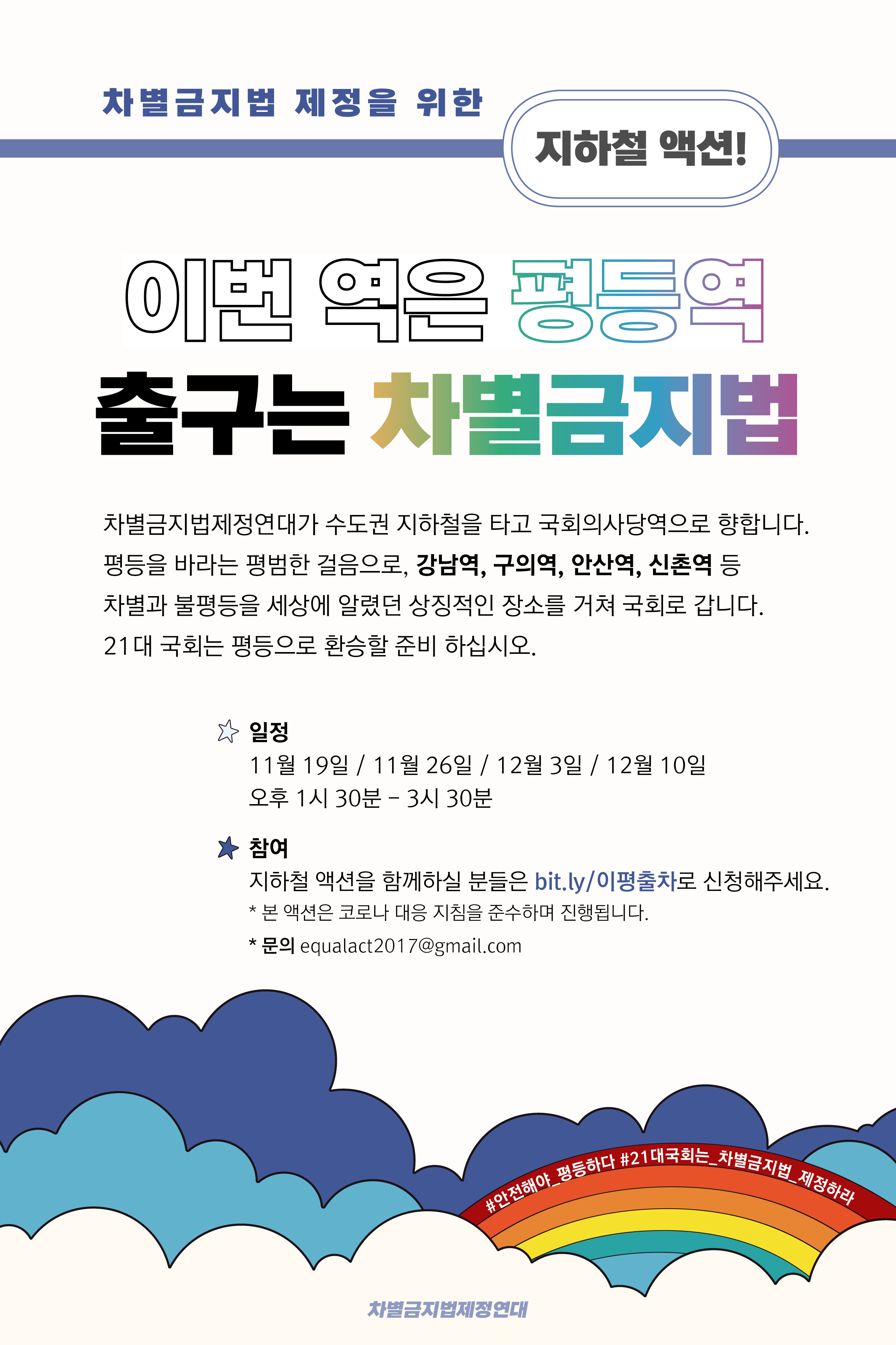 참여 신청은 bit.ly/이평출차 입니다. 참여가 어려우신 분들은 12월 3일과 10일 2시-4시 차별금지법제정연대 페이스북 계정 facebook.com/equalact2017 을 통해 함께해주세요. 지하철에서 만나면 반갑게 인사 나눠요!