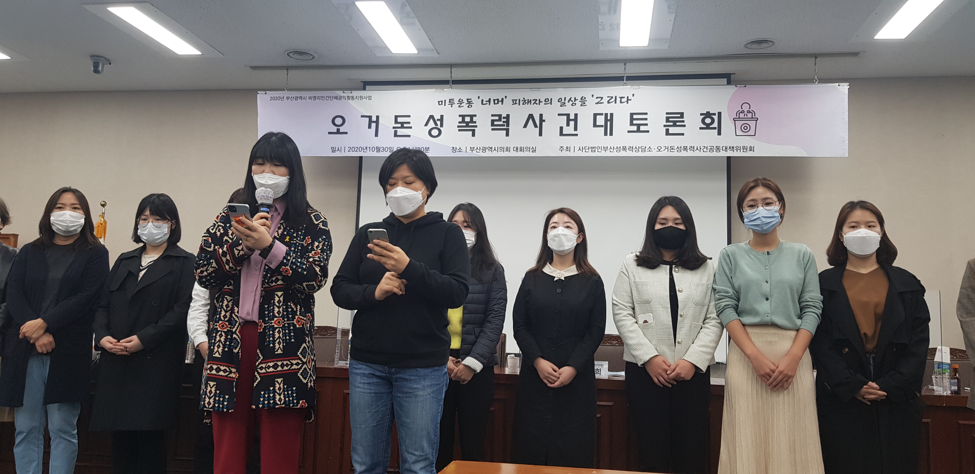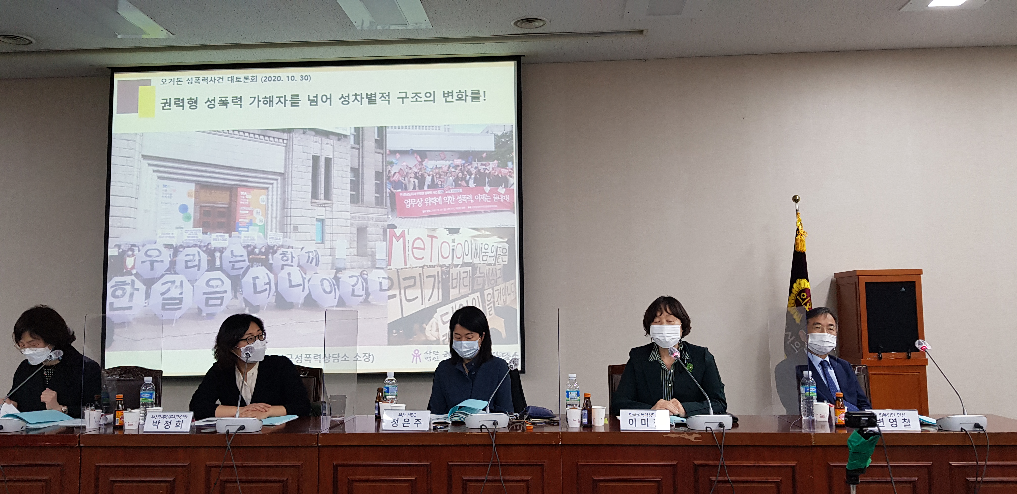 지난 10월 30일, 부산광역시의회 대회의실에서 오거돈성폭력사건 대토론회가 있었습니다. <미투운동 ‘너머’ 피해자의 일상을 ‘그리다’>라는 제목으로 시작된 토론회는 코로나19 방역 관계로 현장에는 최소인원만 참석하였지만, 온-오프라인 모두 진행하여 권력형 성폭력을 다각도로 짚어볼 수 있었습니다. 어떤 논의가 진행되었는지 궁금하시다면, 후기를 끝까지 읽어주세요!