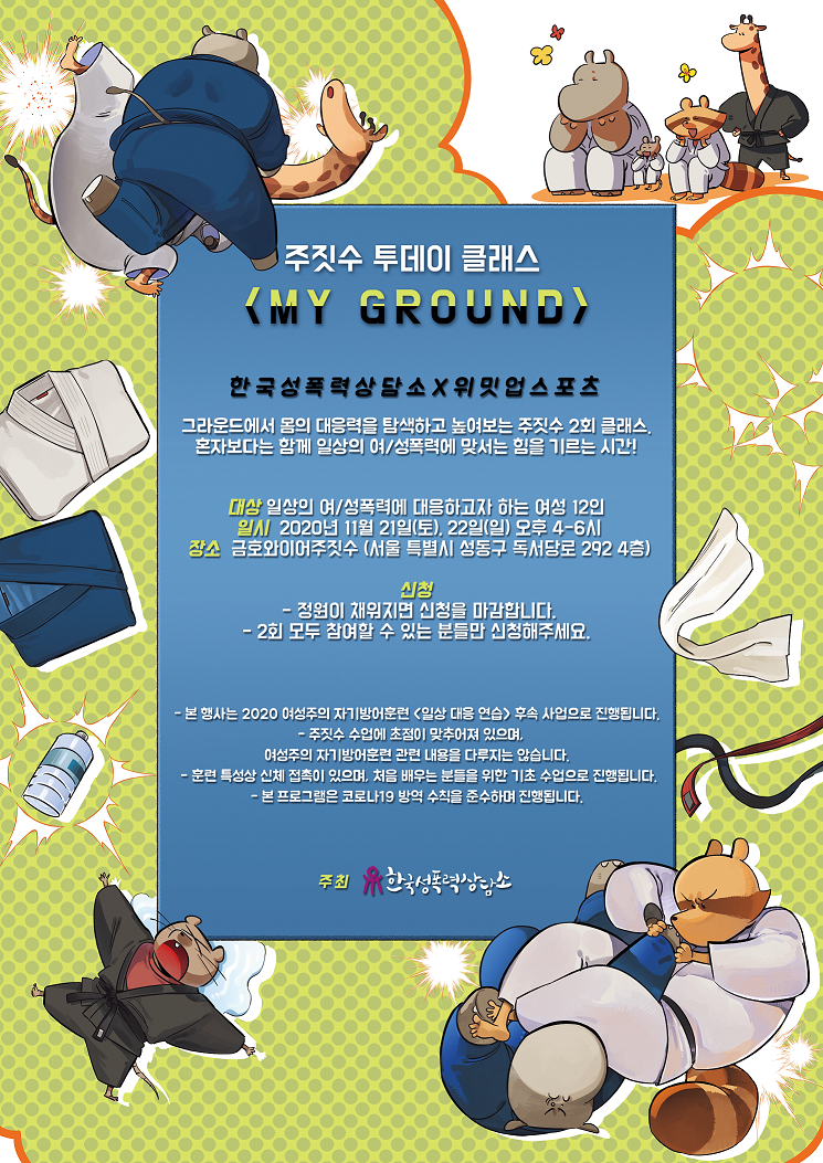 “그라운드에서 몸의 대응력을 탐색하고 높여보는 주짓수 2회 클래스. 혼자보다는 함께 일상의 여/성폭력에 맞서는 힘을 기르는 시간!”