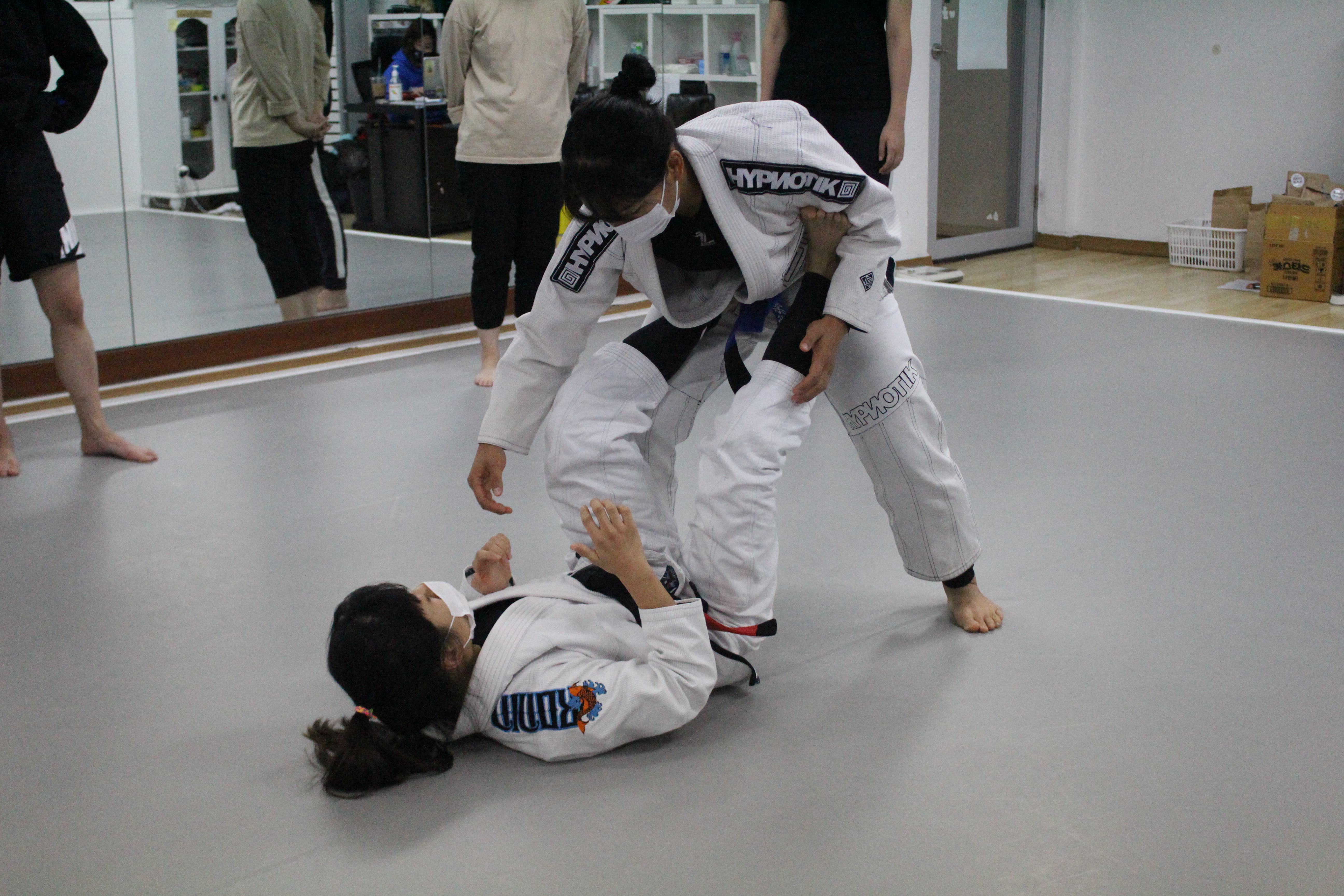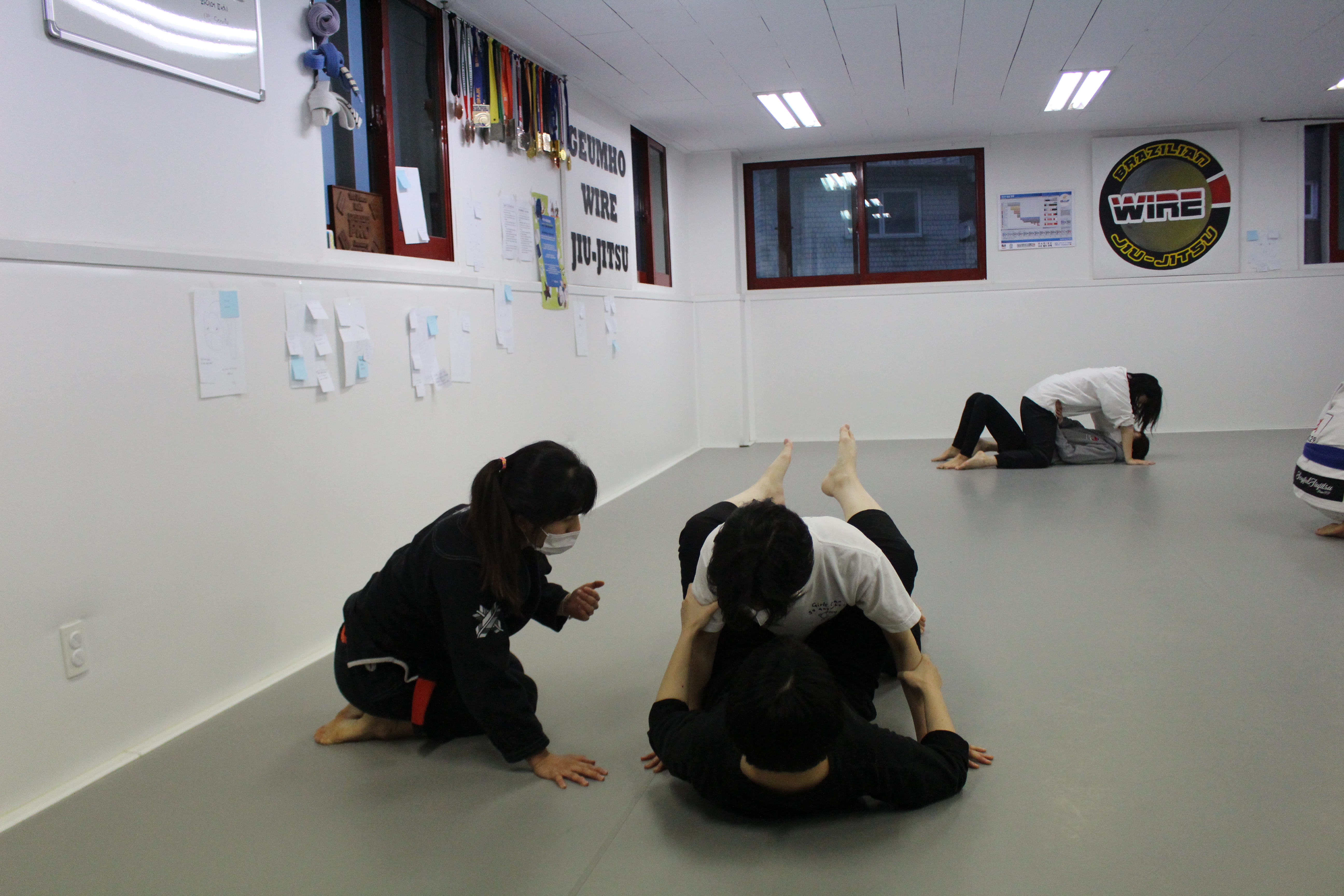본격적인 주짓수 수업에서는 첫 째날에 배웠던 동작을 응용하여 실제 서로 제압하고 제압하는 상대로부터 빠져나가는 연습을 해보았습니다. 새로운 동작도 추가되었습니다. 상대방이 배 위에 올라타 있는 상태에서 빠져나오는 것이었습니다. 내 위에 올라와 있는 상대방의 한쪽 다리를 나의 두 다리로 감싸 묶고, 그것을 지지받아 몸을 옆으로 돌려 빠져나오는 동작을 배우기도 했는데, 상대방이 몸을 누르고 있기 때문에 첫날보다 더 많은 힘이 들어갔습니다. 영광스럽게도! 관장님이 연습 상대가 되어주셨는데요, 당연한 일이지만 관장님을 제압할 수도, 관장님에게서 빠져나갈 수도 없었습니다. 하지만 무엇보다도 이번 두 번의 수업에서 좋았던 것은 멋진 여성 강사님들을 볼 수 있었다는 것...! 강사 선생님들의 열정적인 수업, 함께 참여했던 분들의 적극적인 태도 때문에 정말 이틀 후회없이 배우고 운동했다는 생각이 들었습니다. 다채롭게 수업을 꾸며주신 위밋업스포츠에 감사한 시간이었습니다.