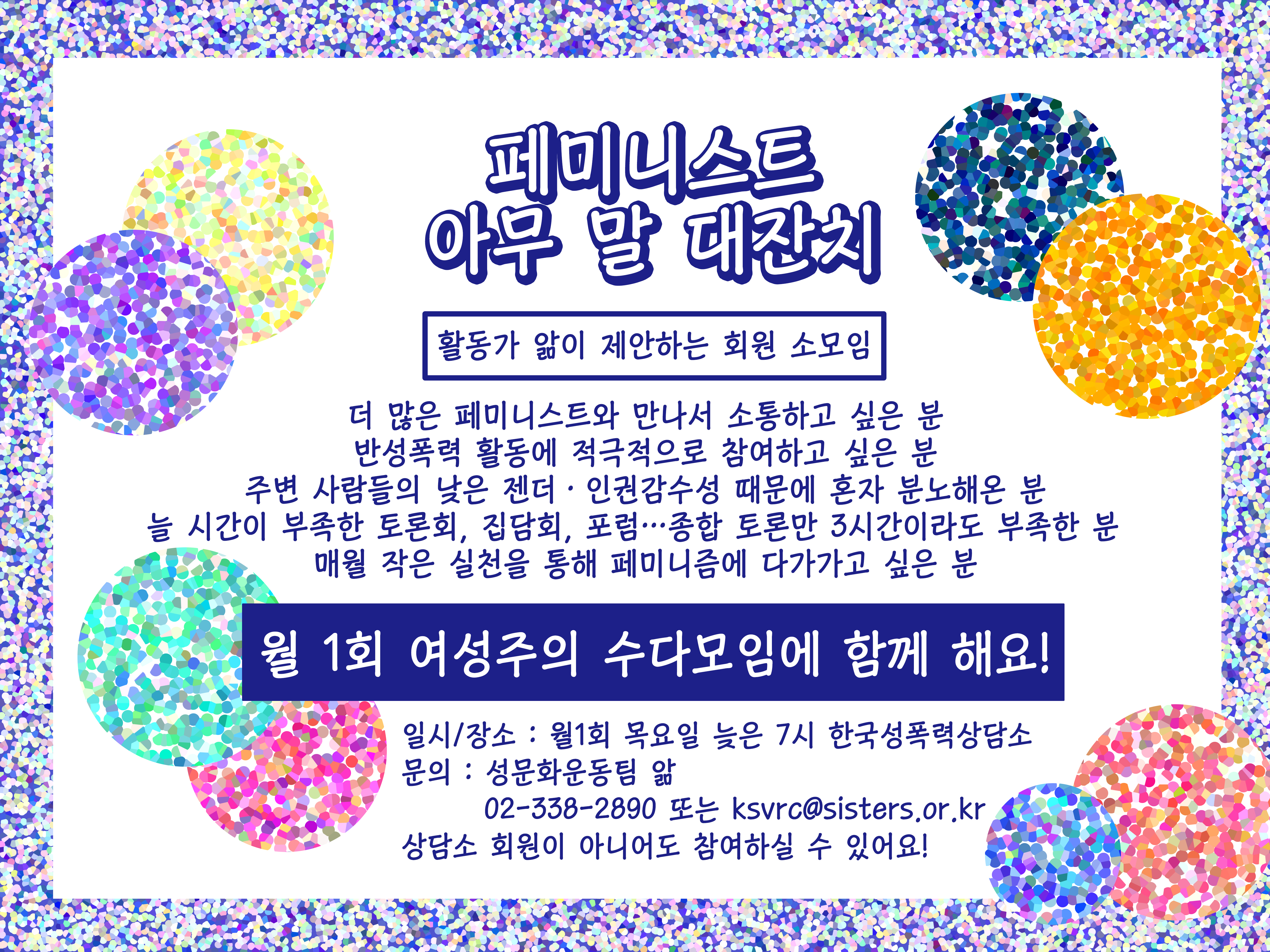 ◆ 페미니스트 아무 말 대잔치에 참여하고 싶다면? 올해 "페미니스트 아무 말 대잔치"는 월1회 여성주의 수다모임으로 매월 셋째 주 목요일에 진행하되, 부득이한 경우에는 사전 협의하여 다른 주 목요일로 일정을 조정하는 것을 원칙으로 운영될 예정입니다.