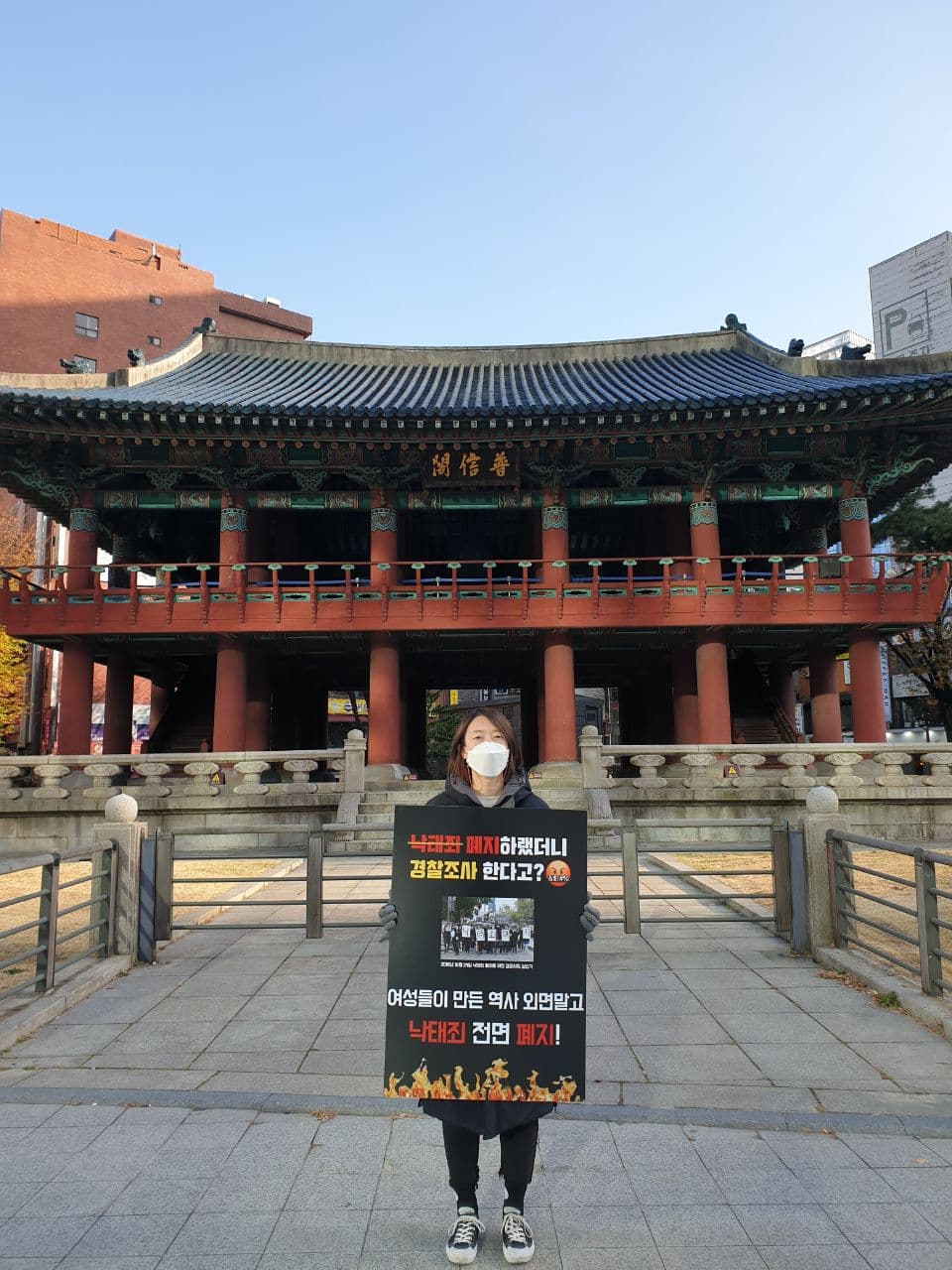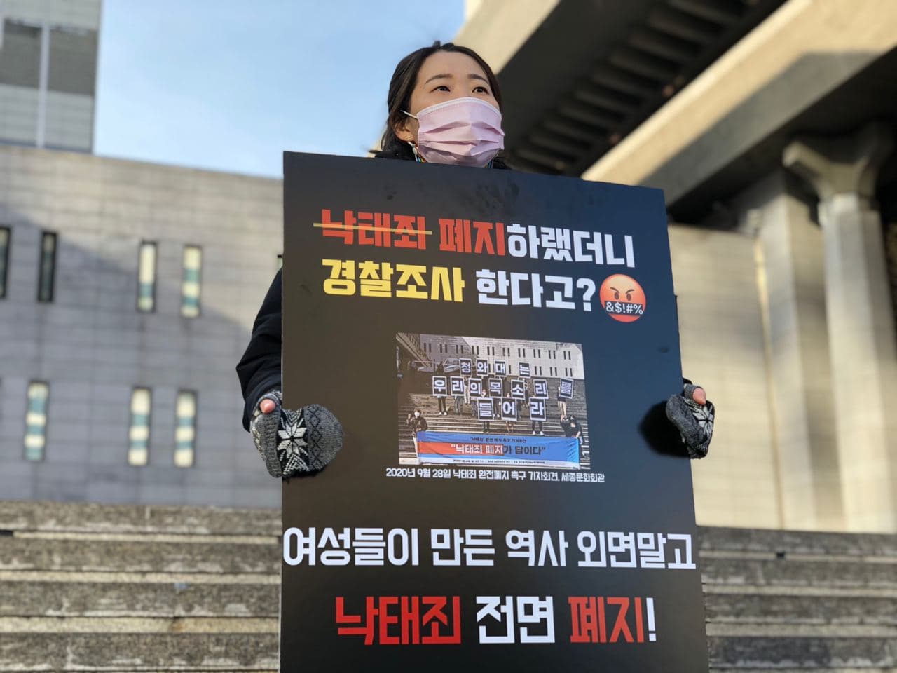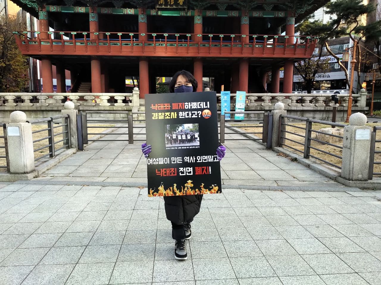 이에 한국성폭력상담소 활동가들은 부당한 경찰조사에 항의하고, 낙태죄 전면폐지라는 여성들의 역사를 이어나기기 위해 낙태죄 투쟁이 있었던 상징적인 장소 4곳에서 경찰조사가 마칠 시간까지 흩어져 1인 시위를 진행했습니다.