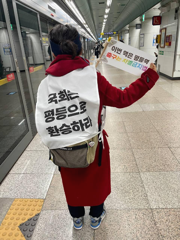 12월 10일 세계인권선언 기념일, 상담소가 함께한 액션은 지하철 액션 <이번 역은 평등역, 출구는 차별금지법>입니다. 기념일에 열린 72인의 공동행동에 맞춰 더 많은 사람들과 함께 하기 위해 원래 예정되어 있던 오이도역과 안산역이 아니라 국회와 광화문을 오가는 방식으로 노선을 변경하여 진행했습니다. 지하철 액션 참가자들은 온 몸으로 국회가 차별금지법 제정에 나서야 한다는 메시지를 전하며, 안산역과 오이도역의 이야기를 함께 공유했습니다.