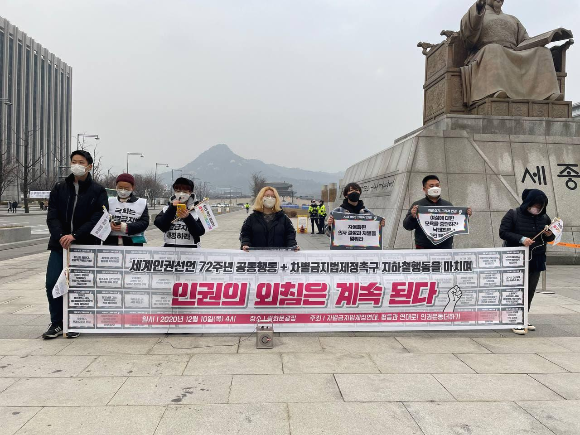 얼마 전 문재인 대통령은 국가인권위원회의 특별보고를 받고 “코로나19와 혐오·차별을 인권적 관점에서 해법을 마련하는 데 노력해달라”고 당부했다고 합니다. 나아가 차별금지법에 대해서도 “일부 반대도 있지만 국회에서 활발하게 논의하면서 사회적 합의와 공감대를 넓혀 나가길 기대한다”고 밝혔다고 합니다. 기사읽기 2020년도 저물어갑니다. 올해가 차별금지법 없는 마지막 세계인권선언일이길 기원해봅니다. 혐오와 차별은 극단적인 사건으로 나타나기도 하지만 관습처럼 우리의 언어와 인식과 행동에 베어있어서 말하지 않고 문제 삼지 않으면 해결될 수 없을 것입니다. 누구나 혐오와 차별을 하는 사람이 될 수 있도 받는 사람이 될 수 있음을 인지하고 다양한 존재가 평등하게 공존하는 세상, 그 세상에 대한 이정표가 차별금지법입니다. 국회는 조속히 온전한 차별금지법에 대한 논의와 법안 발의를 시작해야합니다.
