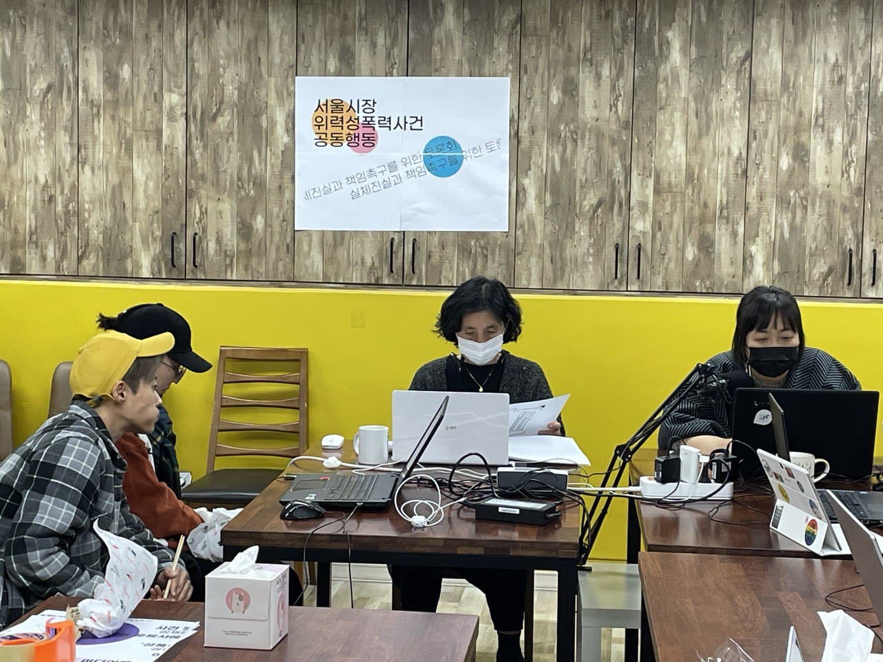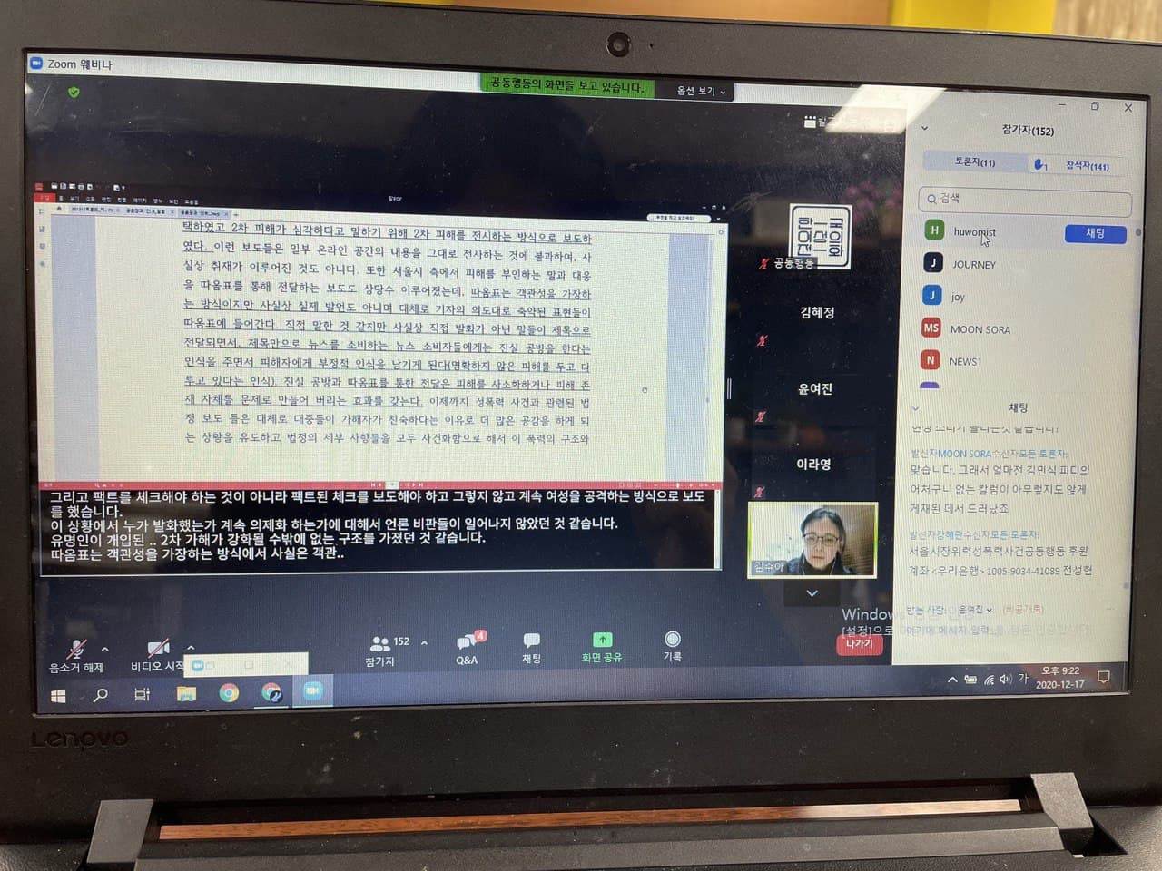 이제까지 서울시장 위력성폭력사건에 대한 기자회견 등과는 다르게, 다양한 전문가, 학자, 작가들이 패널로 함께 하셨습니다. 또한 코로나 상황으로 온라인 진행을 하였는데요, 백칠십여분 정도가 실시간으로 참여하셨습니다.