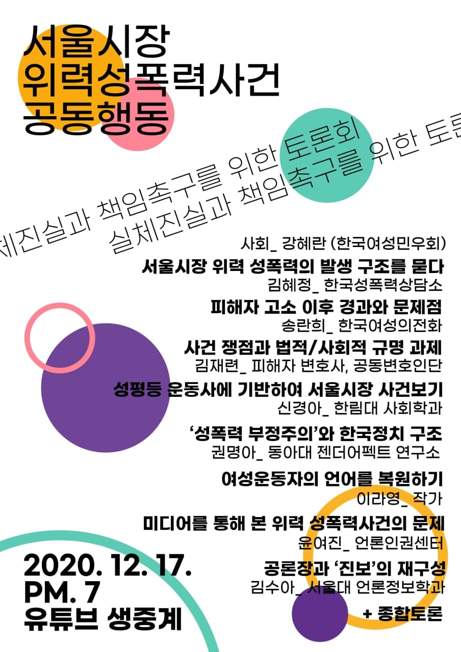 [서울시장 위력성폭력사건 공동행동] 실체진실과 책임촉구를 위한 토론회 ⚬ 일시 : 2020년 12월 17일(목) 저녁7시 ⚬ 장소 : 웨비나 ⚬ 주최 : 서울시장위력성폭력사건공동행동 ■ 사회 - 강혜란 (