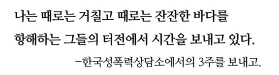 한국성폭력상담소에서의 192시간, NGO 단체 인턴으로서의 192시간은 너무나도 값지고 따뜻한 온기를 느낄 수 있었으며 또 앞으로 어떻게 살아야 할지에 대한 치열한 고민을 할 수 있게끔 해주었습니다.