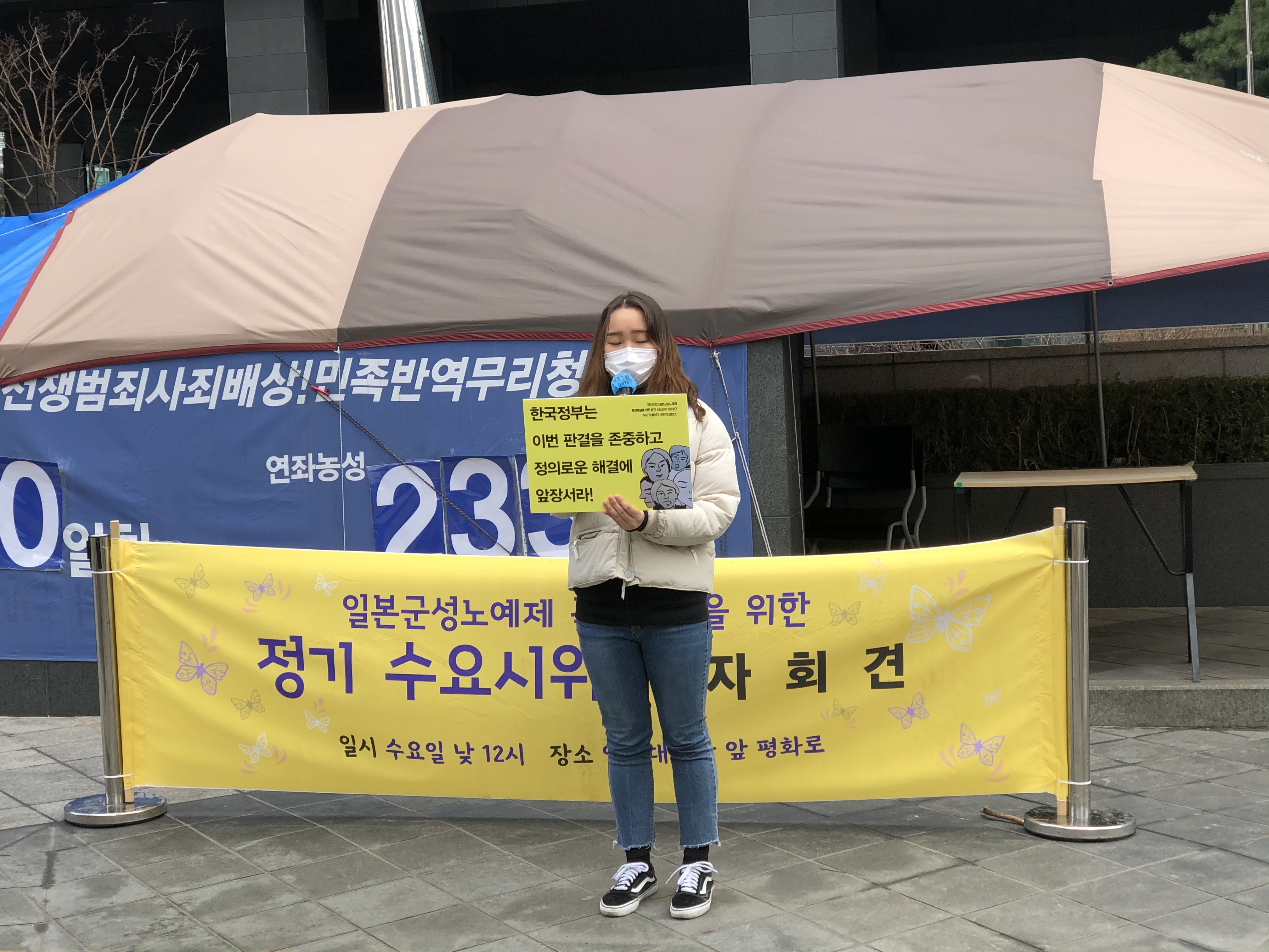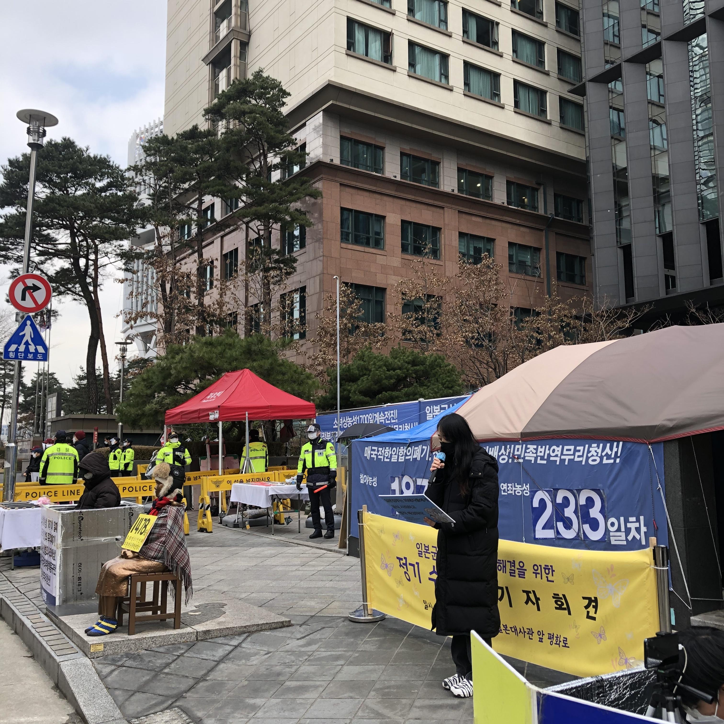 수요시위 당일, 12시에 시작하는 시간에 맞추어 현장에 도착했습니다. 수 많은 경찰, 기자, 그리고 낯선이들로 가득한 현장이었으나, 정의기억연대 활동가님들과 함께 담담하게 준비해온 기자회견을 시작할 수 있었습니다.