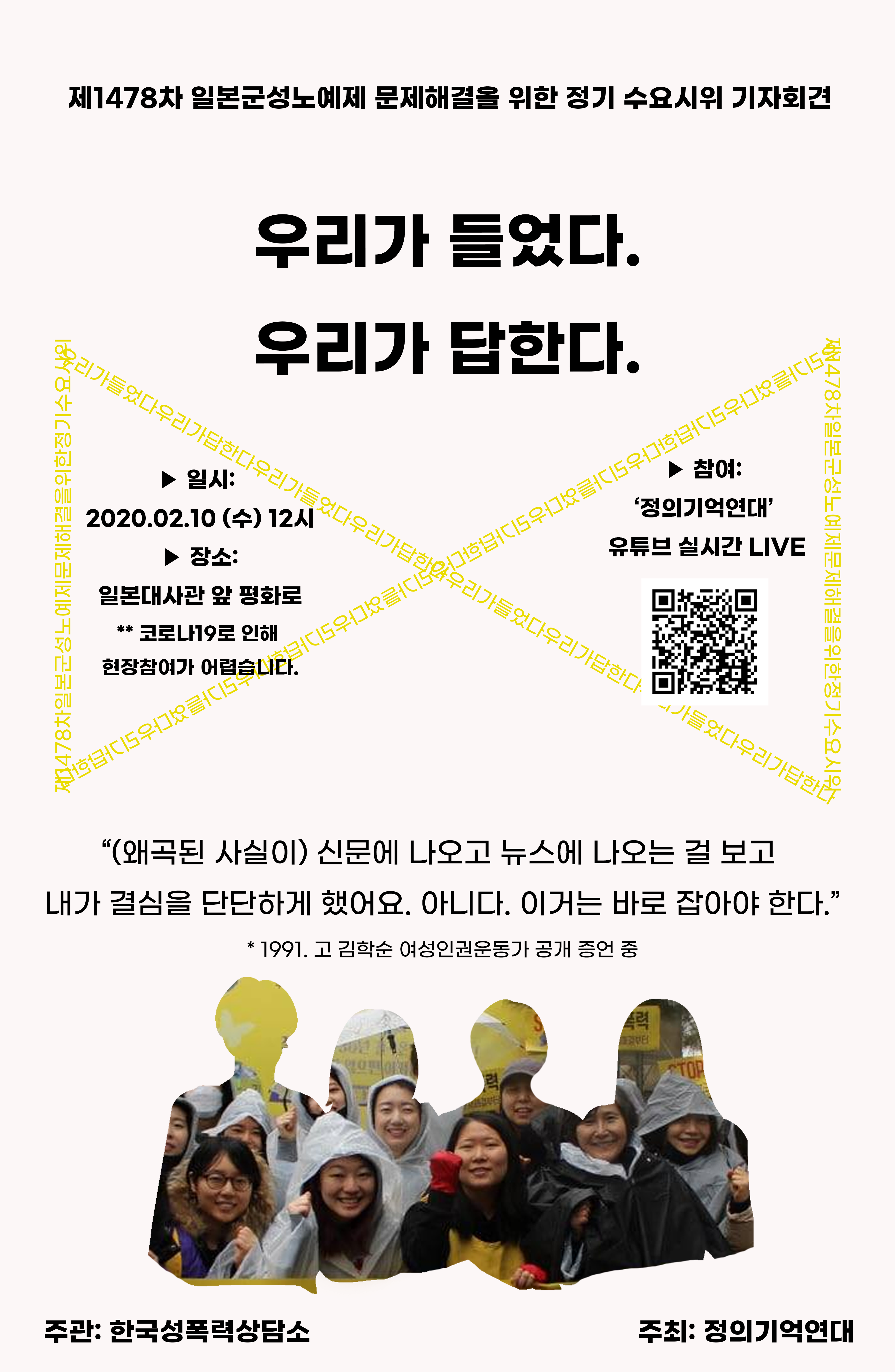 2020년 2월 10일 한국성폭력상담소 및 제1478차 일본군성노예제 문제해결을 위한 정기 수요시위 기자회견 참가자 일동 |