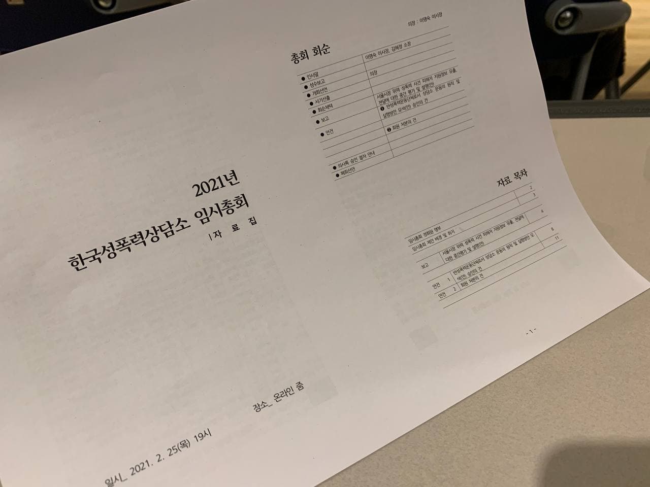 임시총회의 안건은 보고안건으로 서울시장 위력 성폭력 사건 피해자 지원정보 및 전달에 대한 중간 평가 및 설명(안)과 안건1. 반성폭력운동단체로서 상담소 운동의 원칙 및 실행방안 모색(안) 승인의 건과 안건2. 회원처분의 건이었습니다.