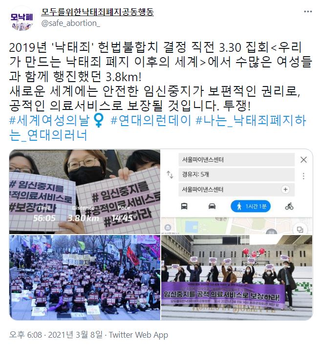 우리는 오늘 형법 제269조 낙태의 죄가 사라진 2021년 3월 8일 여성의 날을 맞이했습니다. 이는 여성의 몸에 대한 국가의 사회구조적인 통제와 억압에 대항하며 함께 연대해 온 투쟁의 결과입니다. 그러나 국가는 2019년 4월 11일 헌법불합치 판결 이후 허용 주수, 사회경제적 사유 등 인권의 역사를 퇴행시키는 또 다른 통제 기준만을 제시할 뿐 2년이 다 되어가는 지금도 안전한 임신중지를 위한 후속 입법 제정 등을 미루며 전반적인 성과 재생산권리보장에 대한 사회적 책임과 의무를 방기하고 있습니다.