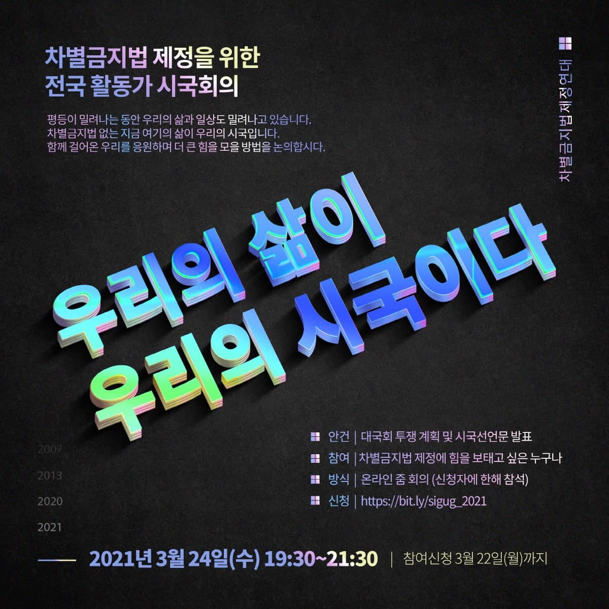 “나중은 없다 차별금지법 지금 당장!”“‘나중에’ 하겠다는 정부여당에 고한다. 당신들을 ‘지금’을 독점할 권한이 없다" "..‘지금’을 내어주지 않을 것이다.” 이 문장을 곱씹게 됩니다. 모든 사람들은 지금을 살아가고 있고, 나중으로 미룰 수 있는 삶은 없으니까요. 위 시국 선언문은 공감하고 동의하는 분들의 연명을 거쳐 4월 8일 발표할 예정입니다. 신문에 차별금지법 제정을 바라는 시민들의 목소리가 대문짝만하게 실릴 수 있도록 모금도 진행중이니 많은 관심과 참여 바랍니다.