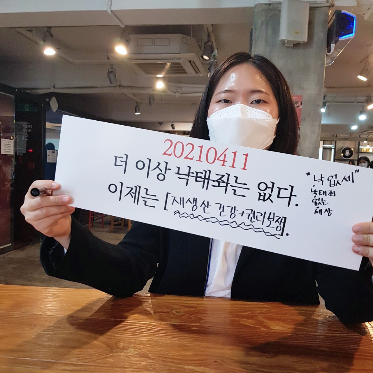 재작년 '낙태죄' 헌법불합치 결정 환영 집회에서 다함께 들었던 슬로건 "20190411, 더이상 낙태죄는 없다"를 오마주하여 "20210411, 더이상 낙태죄는 없다. 이제는 ( )"라는 피켓에 각자 빈칸을 작성해 공유했습니다. 낙태죄 폐지 이후 우리가 원하는 사회를 함께 상상해보는 액션이었습니다.