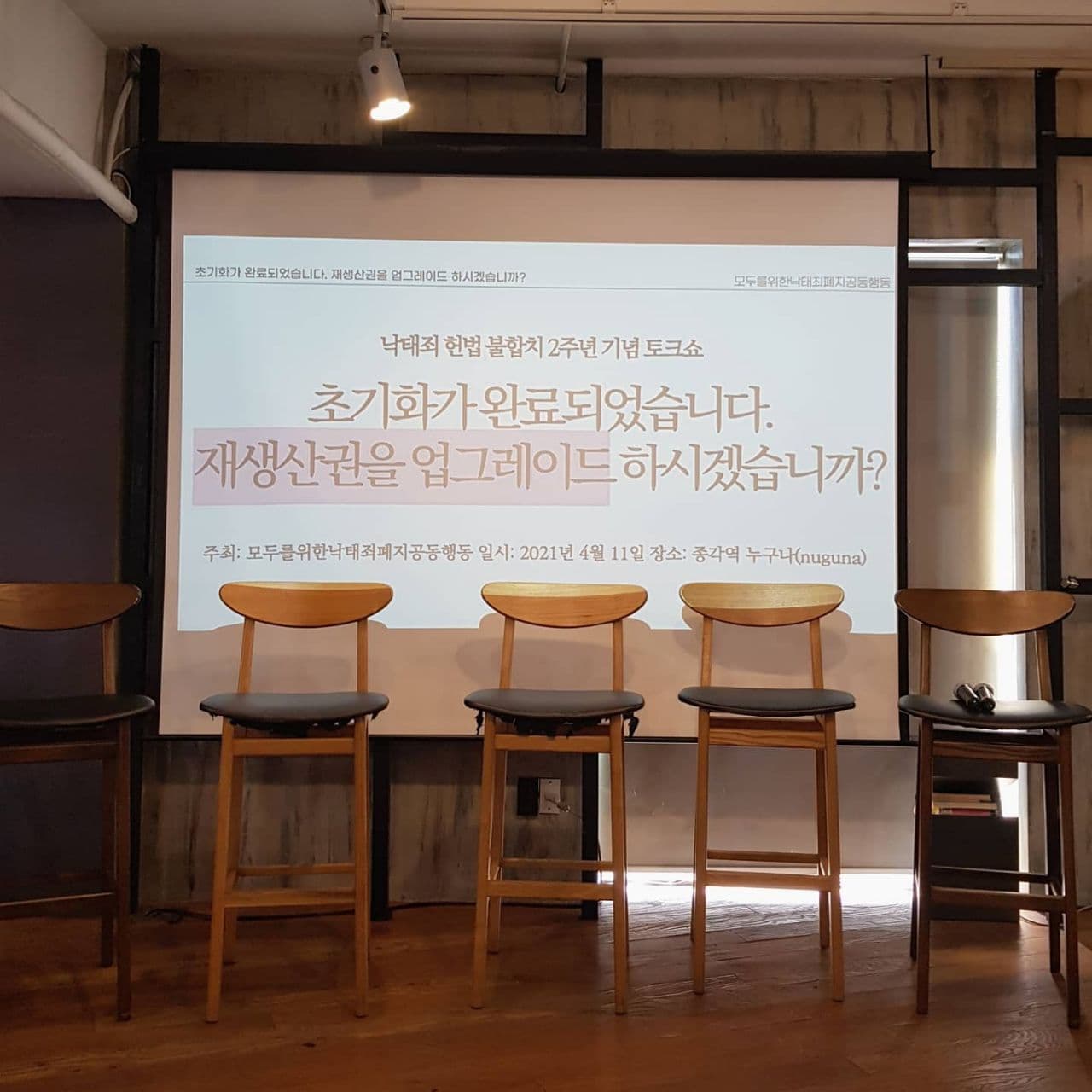 이에 모두를위한낙태죄폐지공동행동은 2021년 4월 11일(일) 오후 3시 종각역 '누구나'에서 '낙태죄' 헌법불합치 2주년 기념 토크쇼 <초기화가 완료되었습니다. 재생산권을 업그레이드 하시겠습니까?>를 진행했습니다. 이번 토크쇼는 코로나19 확산 예방을 위해 오프라인 참여자를 최소 인원으로 제한하고 방역 수칙을 지키며 진행했고, 모낙폐 유튜브를 통해 온라인 실시간 중계를 병행했습니다.
