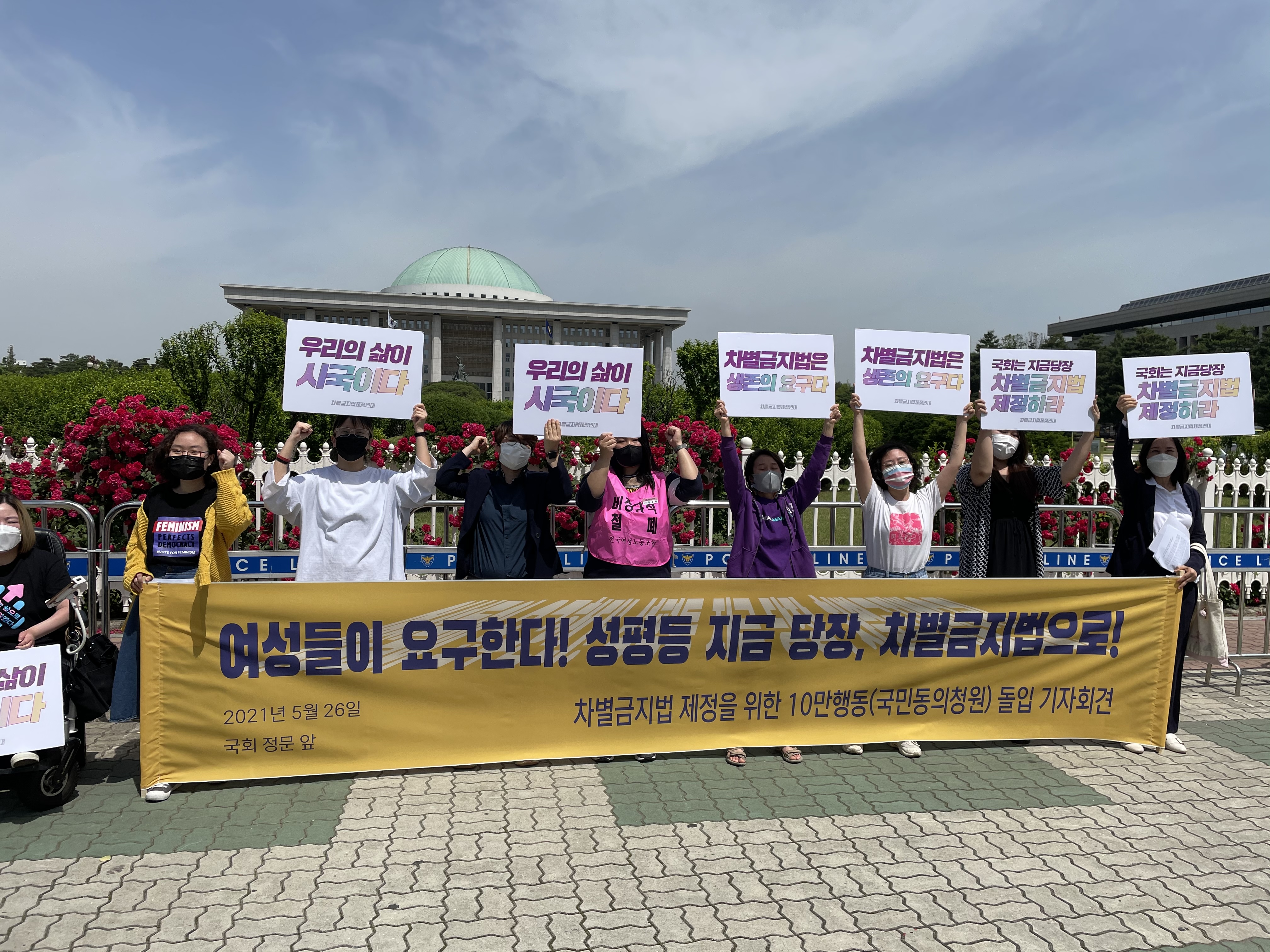 오늘 우리는 더 이상 국회의 직무유기를 두고 보지 않기 위해, 국회를 움직일 힘을 모아내기 위해 이 자리에 모였다. 성평등한 사회를 원하는 우리들은 성차별적 사회구조를 바꾸기 위한 차별금지법을 끊임없이 요구해왔다. 여성이자 노동자로, 여성이자 청소년으로, 여성이자 양육자로, 장애인으로, 이주민으로, 성소수자로 존재하는 우리는 제도부터 일상까지 스며든 차별의 고리를 끊고 평등으로 나아가기 위해 싸워왔고, 이겨왔다. 우리는 2005년 호주제를 폐지했고, 2020년에는 낙태죄를 폐지했다. 2021년, 우리는 이제 차별금지법을 제정하기 위해 10만 행동에 돌입한다. 10만 행동으로 국회 국민동의청원을 넘어 법 제정까지 굳건히 나아갈 것이다.