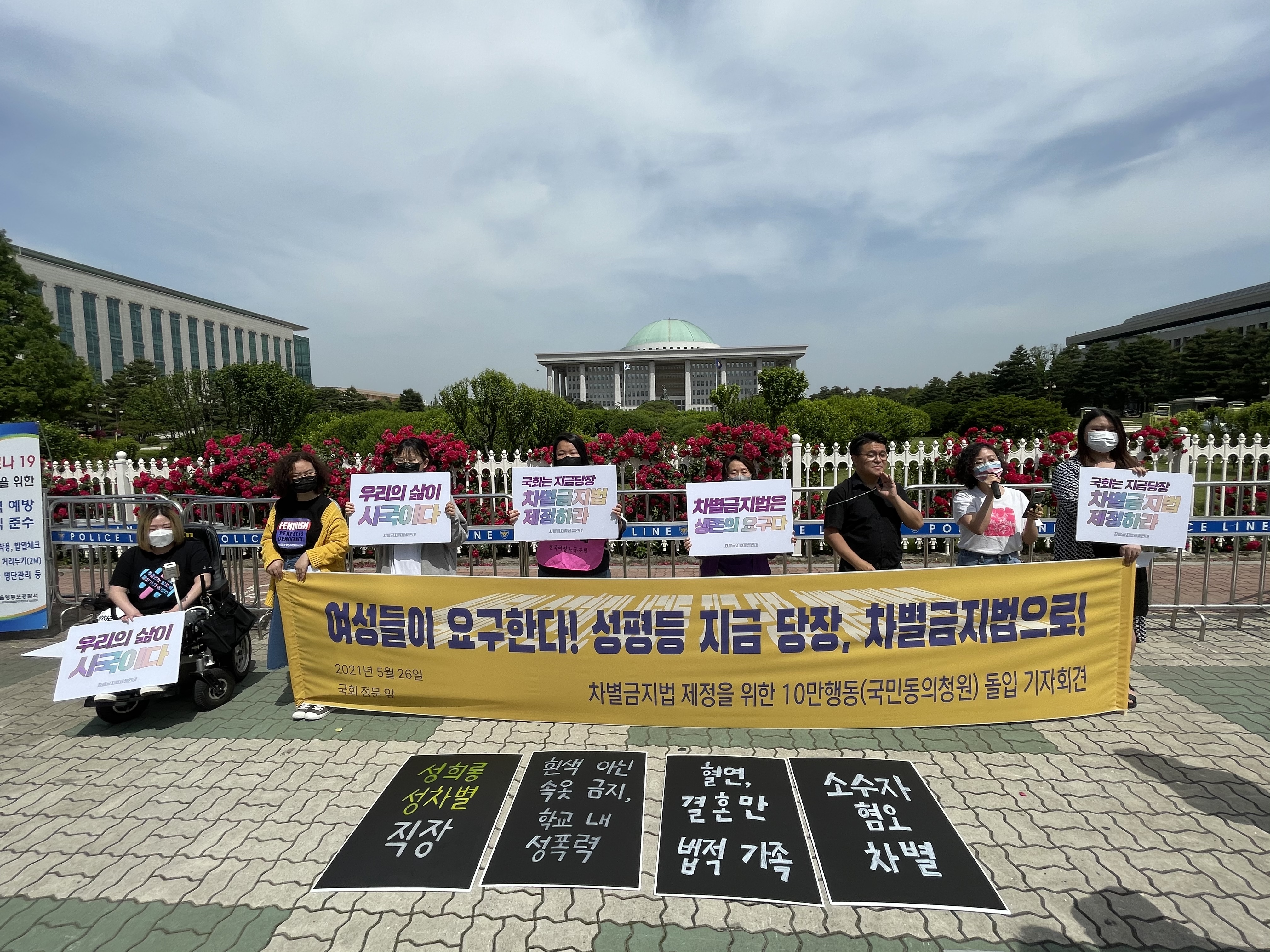지난 5월 26 차별금지법 제정을 위한 10만행동(국민동의청원) 돌입 기자회견 “여성들이 요구한다! 성평등 지금 당장, 차별금지법으로!”가 국회 앞에서 열렸습니다. 24일, 국민동의청원이 시작한지 이틀째가 되는 날이었습니다. 이번 국민동의청원은 동아제약 채용성차별 사건 당사자가 시작해주셨는데요, 여성에 대한 성차별과 성평등에 대한 백래시가 화두인 지금의 현실에서 차별금지법은 여성들의 삶과 어떻게 연관되어 있을까요? 여성들의 삶에 비추어 볼 때 차별금지법은 왜 필요할까요? 차별금지법제정연대에 함께 하고 있는 여성단체들이 모여 이러한 질문을 사회적으로 던지고자 국회 앞에서 기자회견을 열었습니다. 다양한 생애 국면, 위치, 정체성을 가진 여성들의 목소리와 이야기를 통해 성평등과 차별금지법 제정을 촉구하는 기자회견이었습니다.