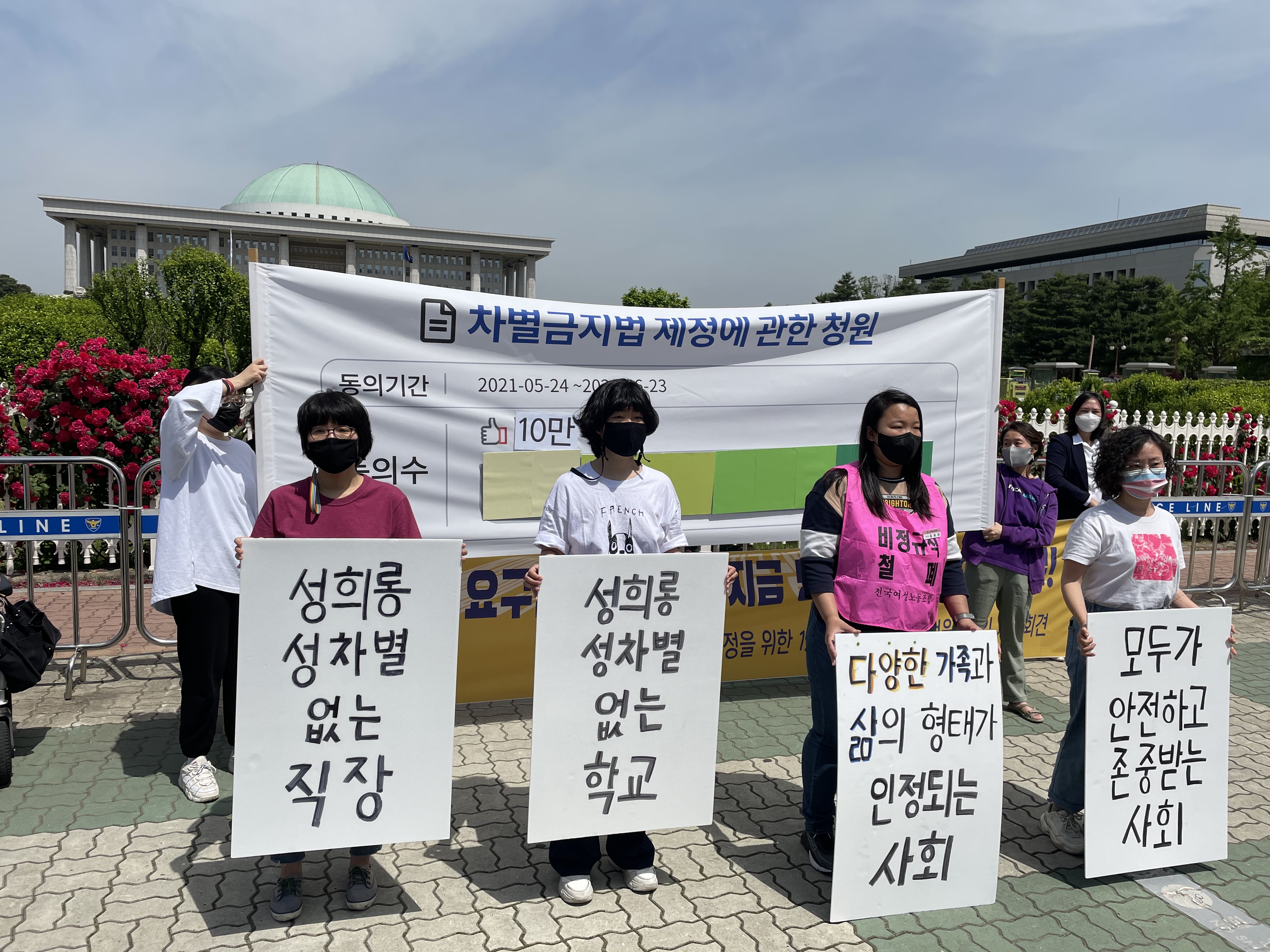 지난 해 6월, 정의당 장혜영 의원 대표발의로 국회에 차별금지법이 발의되었고, 국가인권위원회는 국회에 평등법 제정 촉구 의견을 표명했다. 하지만 차별금지법이 발의된 지 1년이 지난 지금까지도 국회는 법 제정을 위한 어떠한 움직임도 보이지 않고 있다. 차별금지법안은 소관 상임위원회인 법제사법위원회에 상정되었지만 법사위는 여태까지 법안에 대해 제대로 된 논의조차 하지 않았다.