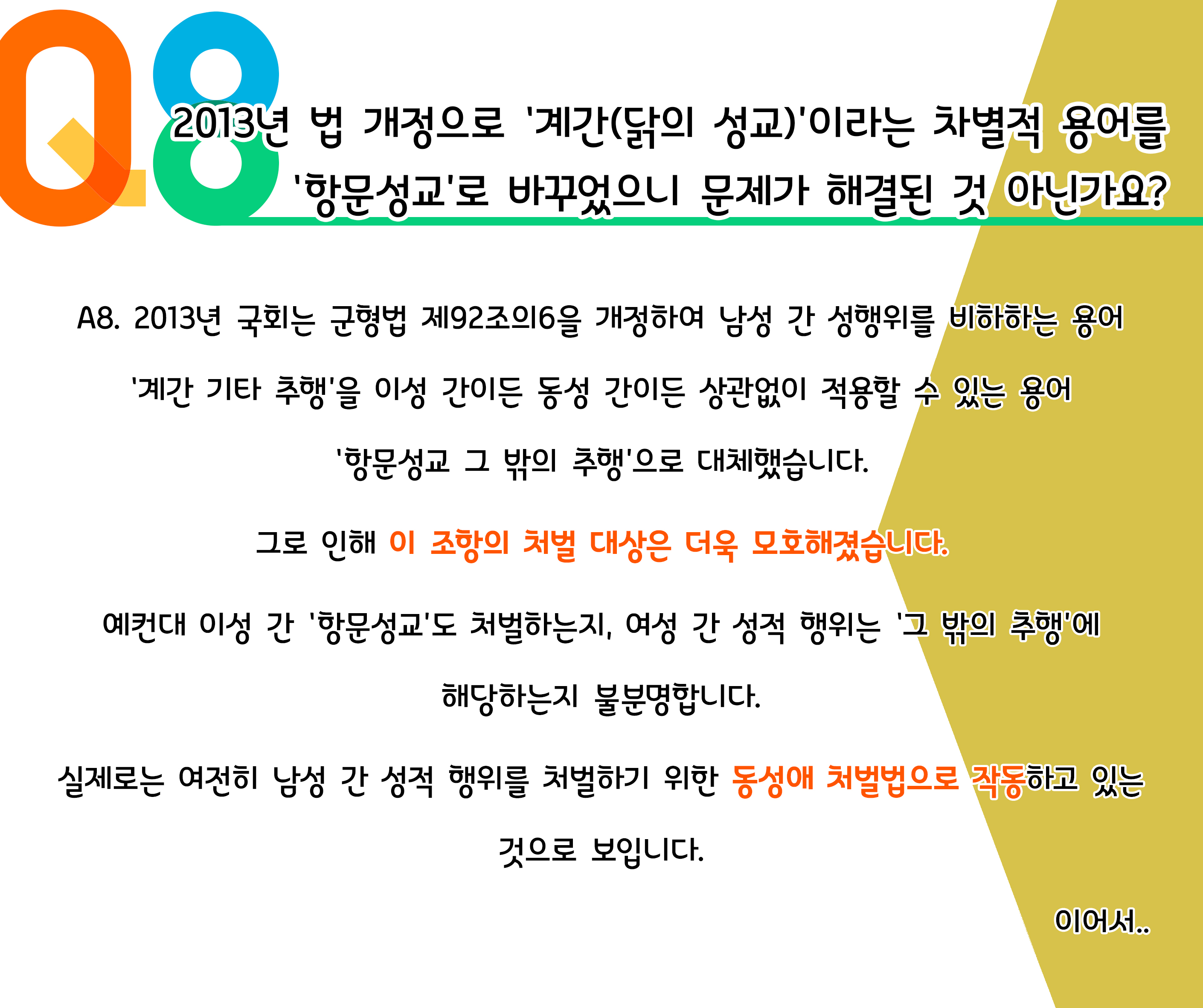 Q8. 2013년 법 개정으로 ‘계간(닭의 성교)’이라는 차별적 용어를 ‘항문성교’로 바꾸었으니 문제가 해결된 것 아닌가요?