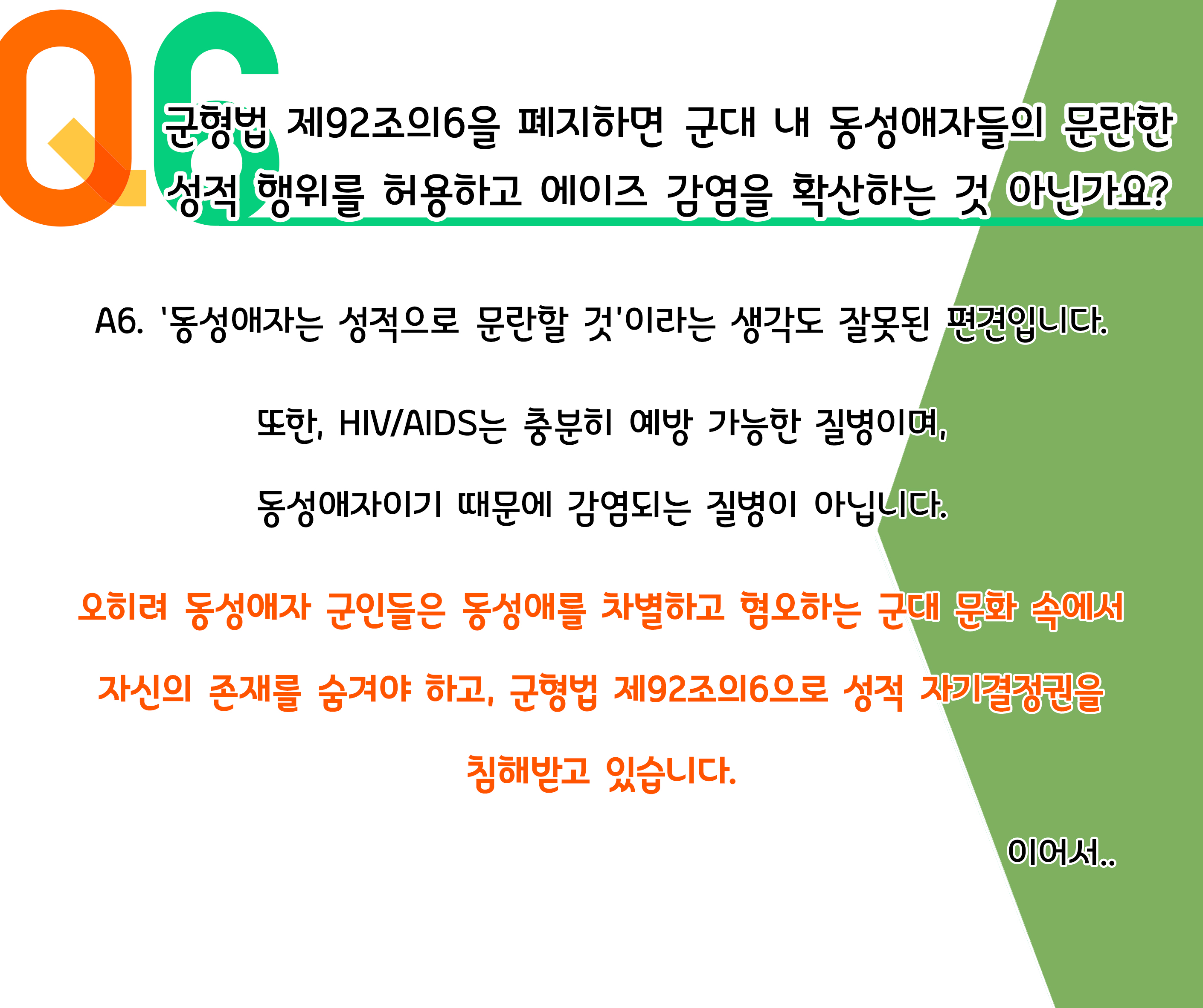 A6. ‘동성애자는 성적으로 문란할 것’이라는 생각도 잘못된 편견입니다. 또한, HIV/AIDS는 충분히 예방 가능한 질병이며, 동성애자이기 때문에 감염되는 질병이 아닙니다. 오히려 동성애자 군인들은 동성애를 차별하고 혐오하는 군대 문화 속에서 자신의 존재를 숨겨야 하고, 군형법 제92조의6으로 성적 자기결정권을 침해받고 있습니다.