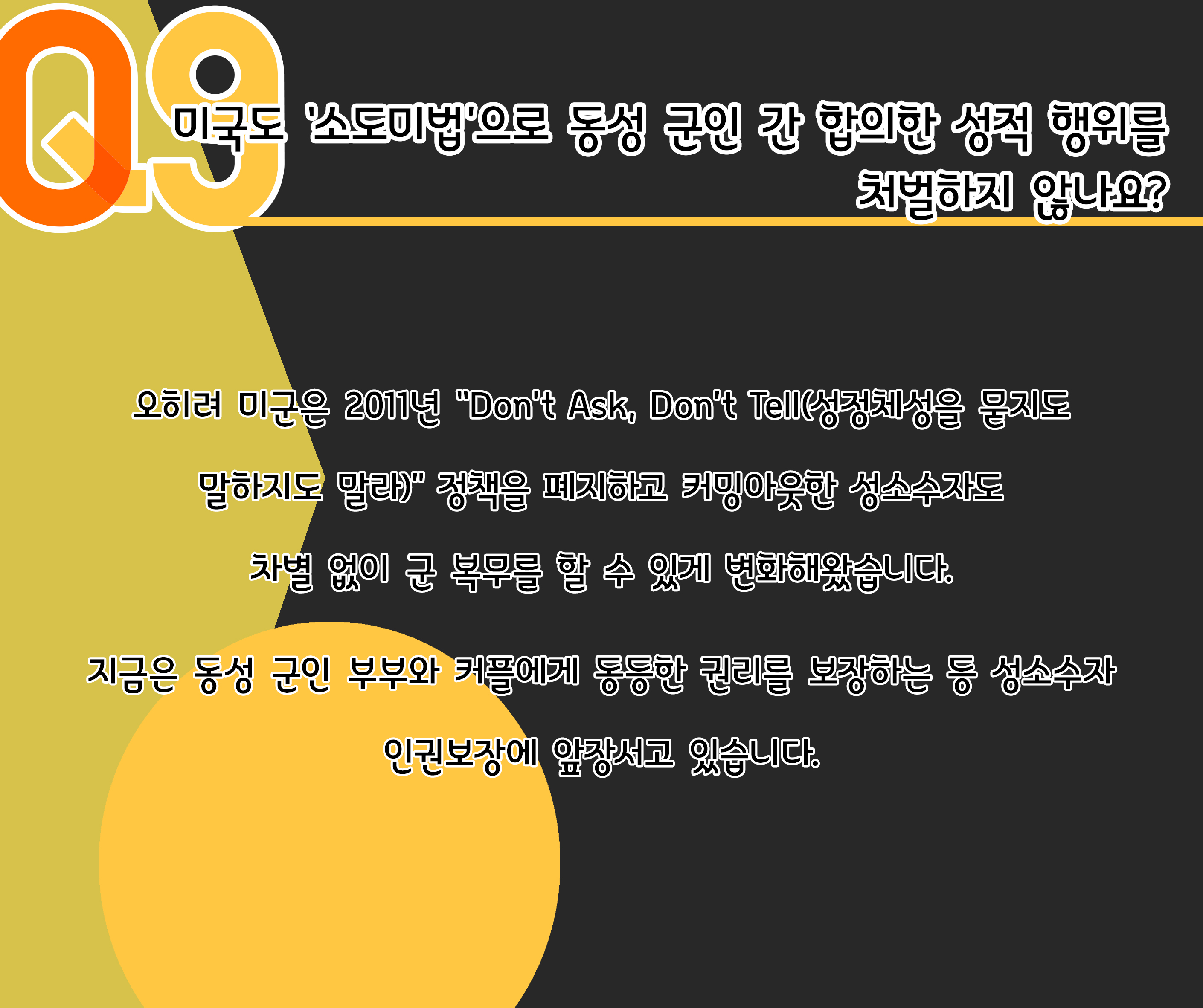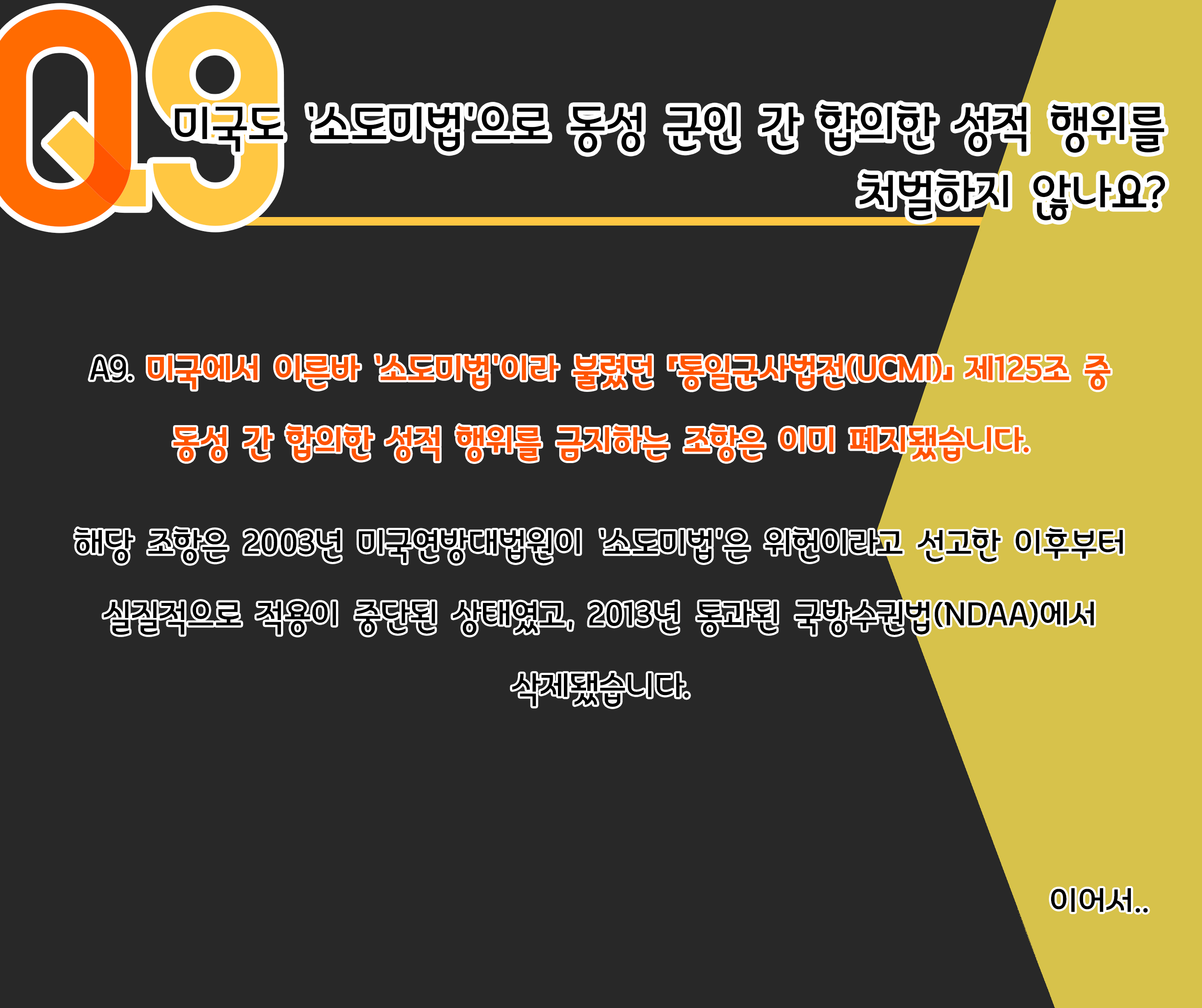 Q9. 미국도 ‘소도미법’으로 동성 군인 간 합의한 성적 행위를 처벌하지 않나요?