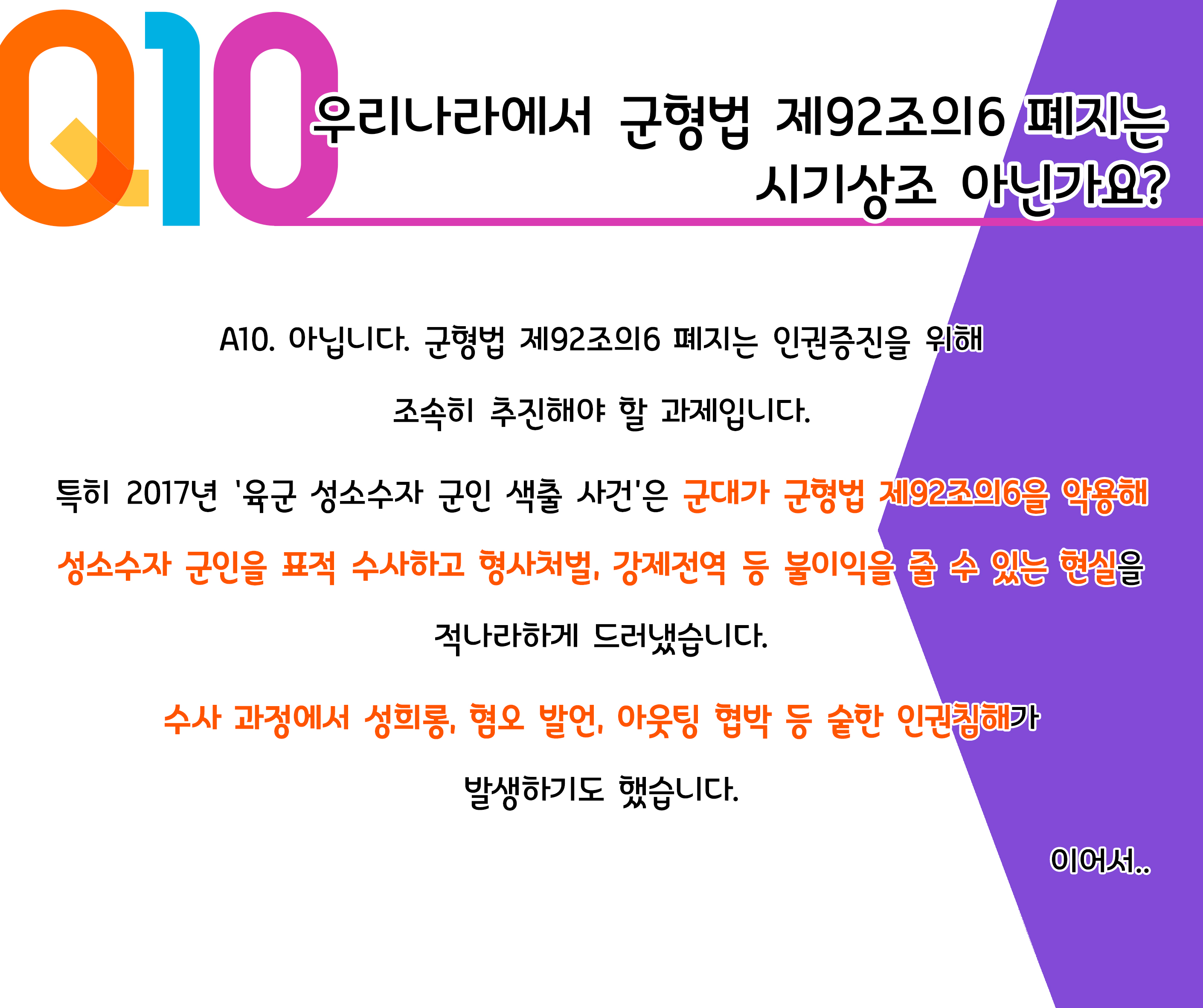Q10. 우리나라에서 군형법 제92조의6 폐지는 시기상조 아닌가요?