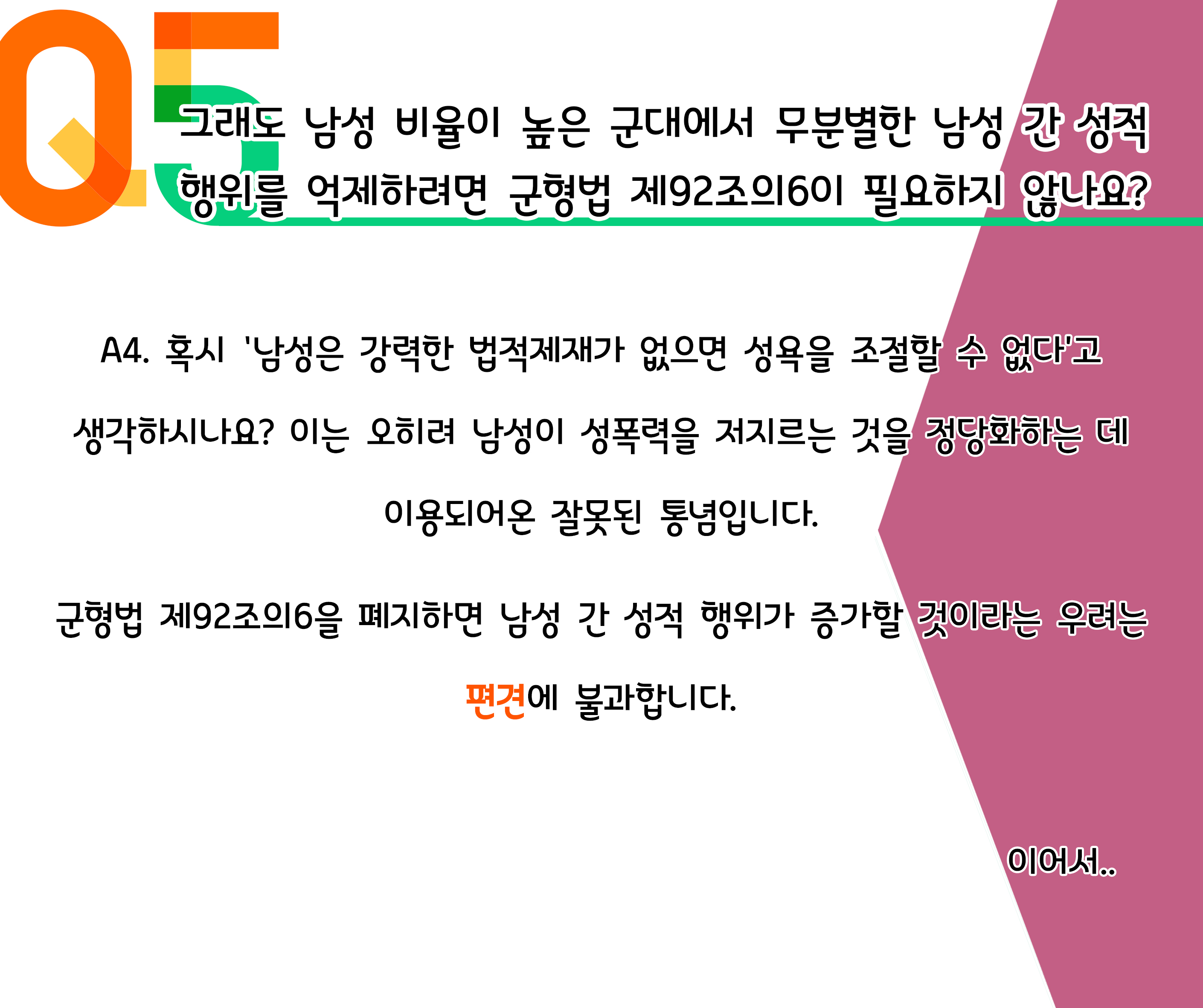 Q5. 그래도 남성 비율이 높은 군대에서 무분별한 남성 간 성적 행위를 억제하려면 군형법 제92조의6이 필요하지 않나요?