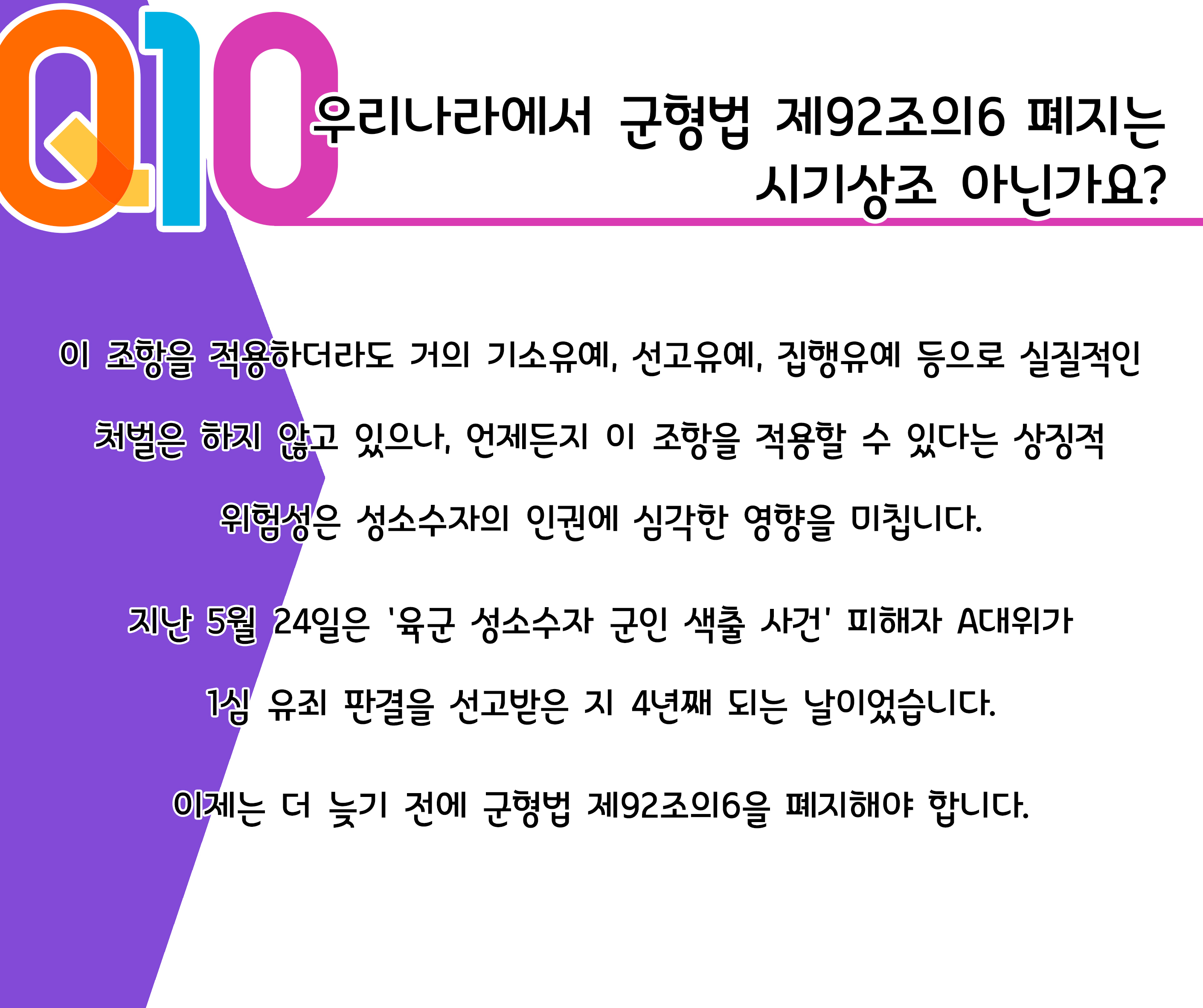 Q10. 우리나라에서 군형법 제92조의6 폐지는 시기상조 아닌가요?