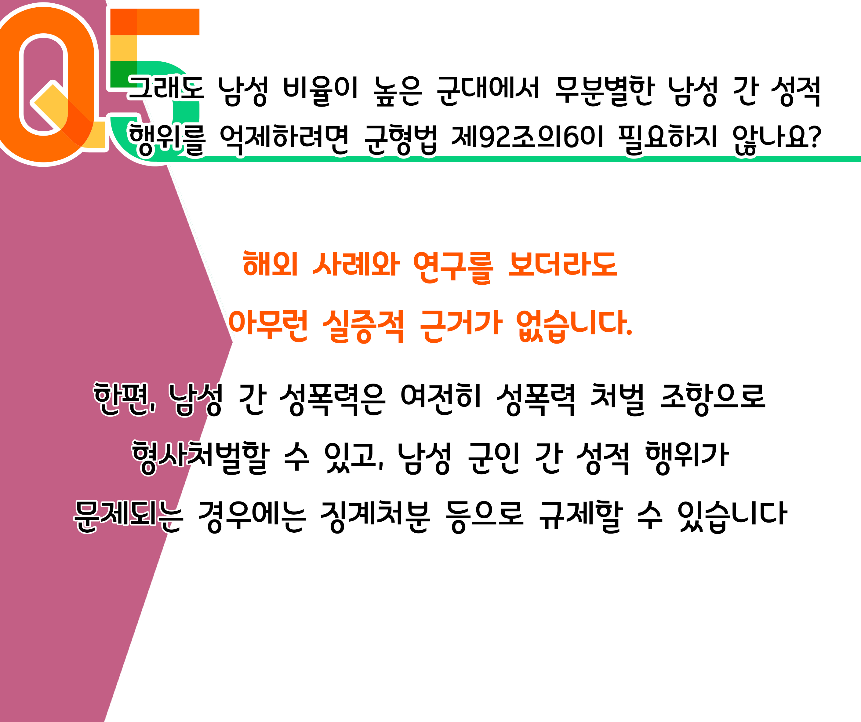 Q5. 그래도 남성 비율이 높은 군대에서 무분별한 남성 간 성적 행위를 억제하려면 군형법 제92조의6이 필요하지 않나요?