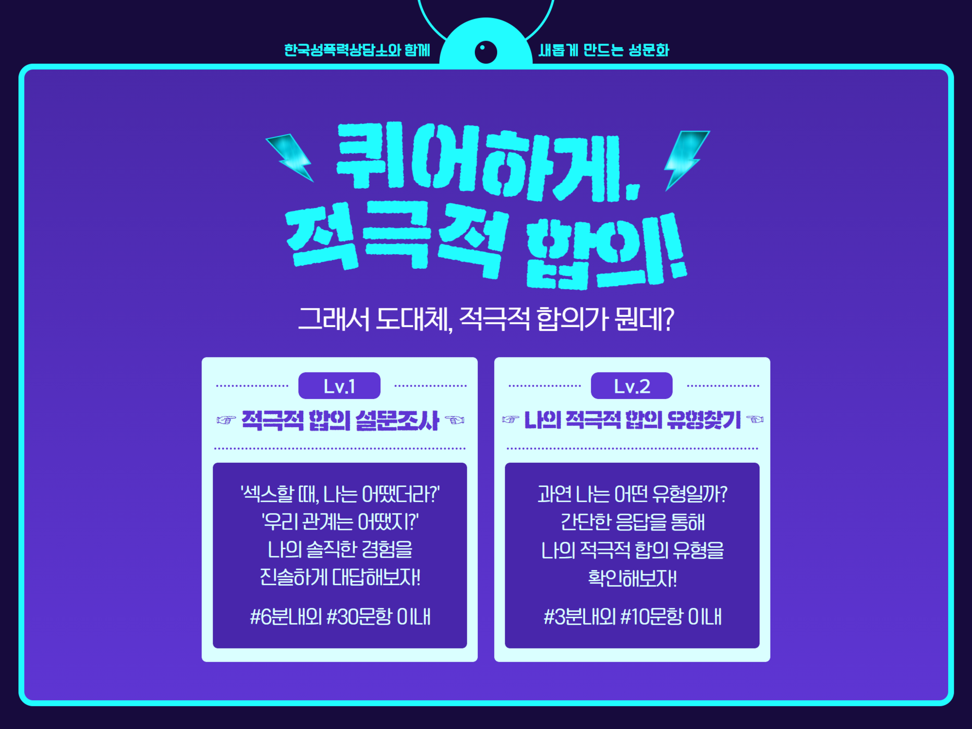 한국성폭력상담소 온라인 부스 <퀴어하게, 적극적 합의!>에서는 <적극적 합의 설문조사>와 <나의 적극적 합의 유형 찾기>를 진행하고 있습니다. 많은 관심과 참여를 바랍니다!