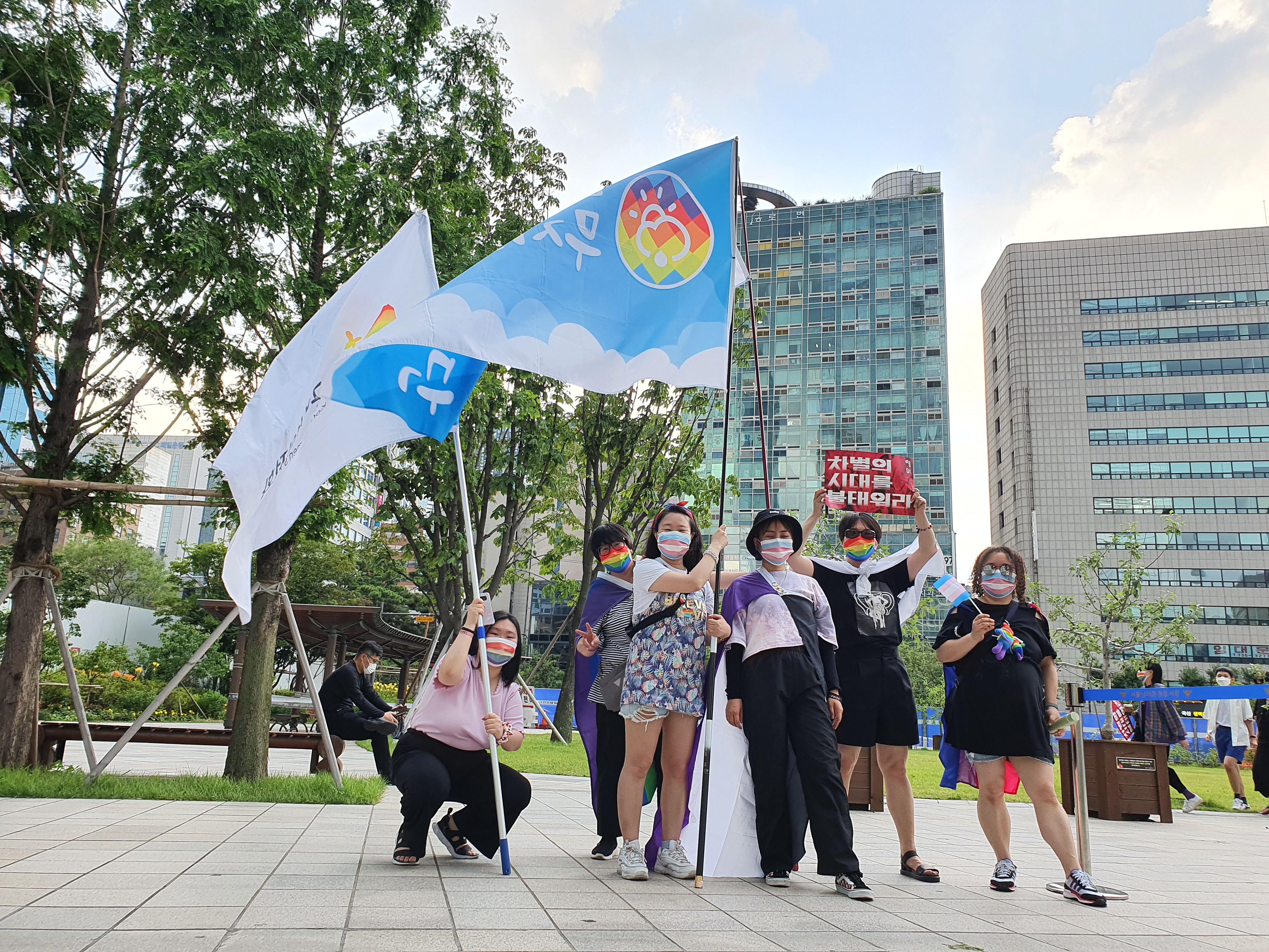 6조는 비온뒤무지개재단, 한국성적소수자문화인권센터, 한국성폭력상담소, 한국여성의전화 총 4개 단체가 함께했어요. 마지막에 출발하는 조여서 대기 시간이 유독 길었는데, 서로 자기소개를 하고 각자 챙겨온 무지개 굿즈도 자랑하고 함께 깃발과 깃대를 정비하면서 연대의식을 쌓을 수 있었습니다(선글라스와 마스크로 무장했던 저는 다음날 이마만 새까맣게 타버린 얼굴로 출근하게 됩니다).
