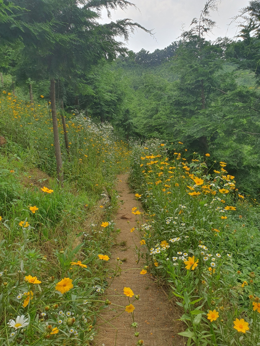은평에 있는 봉산에 다녀왔습니다. 숲이 우거져서 뜨거운 태양을 피할 수 있었어요. 속도를 높이지 않고 꾸준히 걷는 동안 지금껏 몰랐던 서로의 소소한 이야기를 들을 수 있었습니다. 편백나무 숲에 만개한 금계국과 데이지 같은 꽃들 사이를 걸으면서 인생사진을 찍으며 행복한 시간을 가졌어요. 산에서 내려오는 길에 만난 소나기도 반가웠답니다. 비를 피하러 들어간 처마 밑에서 나눈 대화들, 잊지 못할 것 같아요.
