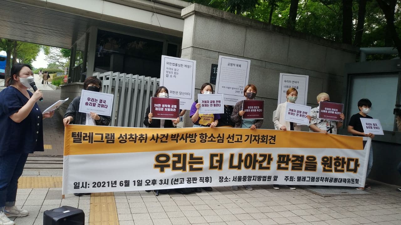 2021년 6월 1일, 텔레그램 성착취 사건에서 박사방을 만들고 주도했던 5인에 대한 2심 선고가 열렸습니다. 이들은 ‘박사방’이라는 이름을 내걸고 조직적인 역할분담을 통해 계속적, 반복적으로 범죄를 저지르며 서로 증폭시켜왔음에도 하나같이 이를 부인하고 축소, 왜곡하였습니다. 이에 대하여 텔레그램 성착취 공동대책위원회는 박사방 항소심 선고에 대한 기자회견을 진행하였습니다.